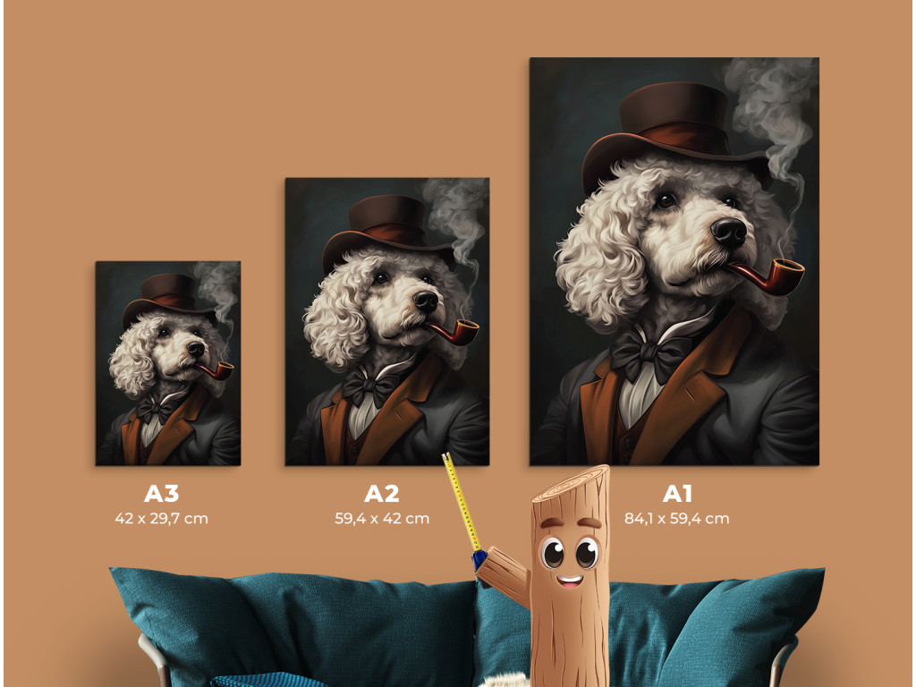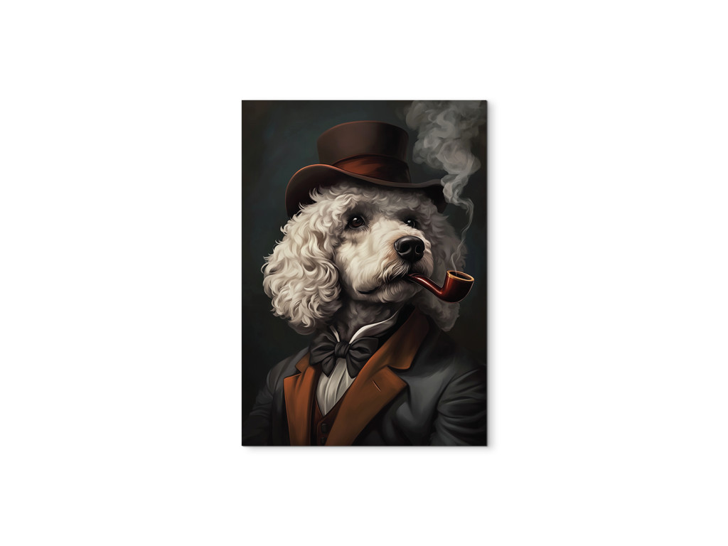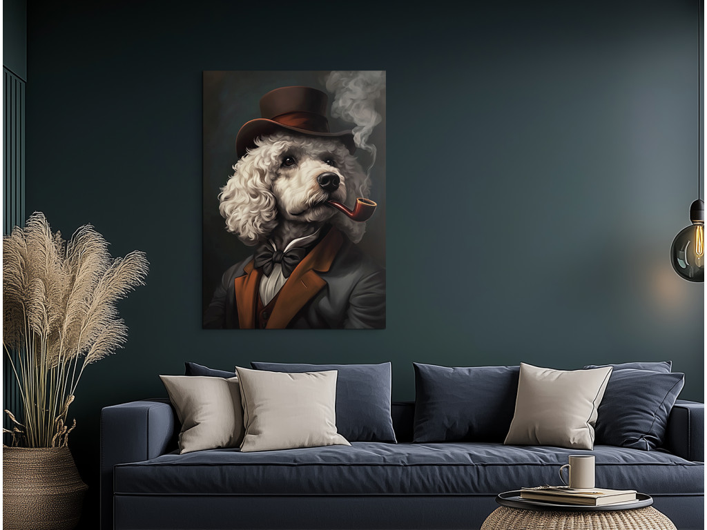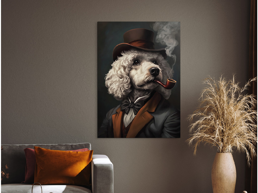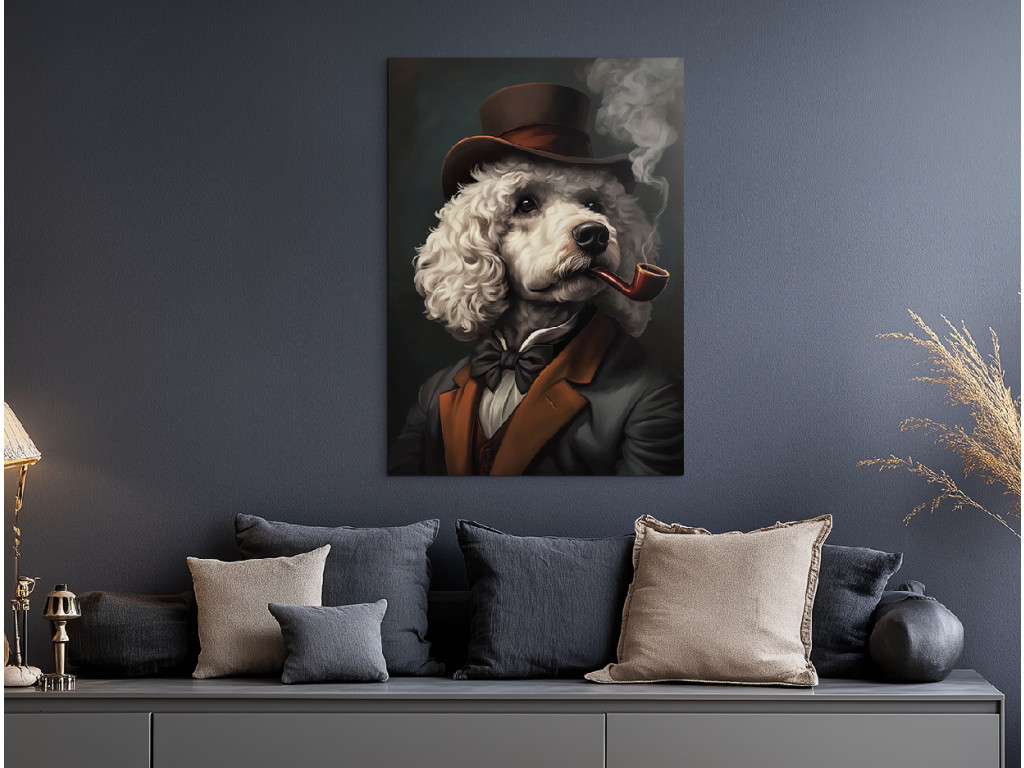 A Kalapos uszkár egy elbűvölő portré egy uszkárról, aki elegáns zakóban, csokornyakkendőben és kalapban igazi, jó ízlésű úriembernek tűnik. A pipa, amelyből füst száll fel, jellegzetes, szinte emberi karaktert és egy csipetnyi figyelmességet kölcsönöz neki. A sötét háttér kiemeli sziluettjét, és egy művészi, perspektívás portré benyomását kelti - ideális alkotás a kutyák és az eredeti művészeti humor szerelmeseinek.