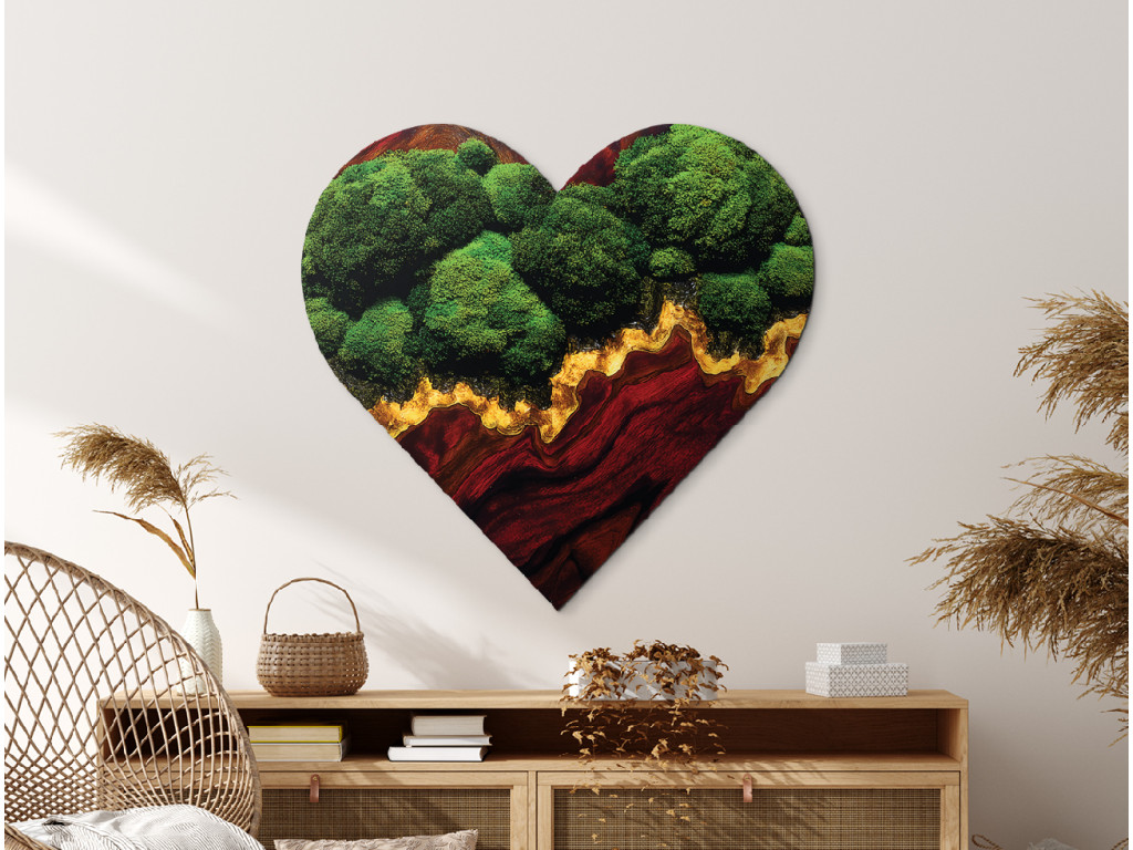 A Szívalakú mohahatású Összekapcsolódás (UV-nyomat) élethű, mégsem igényel öntözést vagy fényt. A modern UV‑technológia valósághű 3D hatást ad gondozás nélkül. A kép hosszú éveken át megőrzi friss megjelenését, és kedvezőbb árú, mint a klasszikus mohaképek. Válassz egy eredeti darabot, amely a természet szépségét a praktikummal ötvözi.