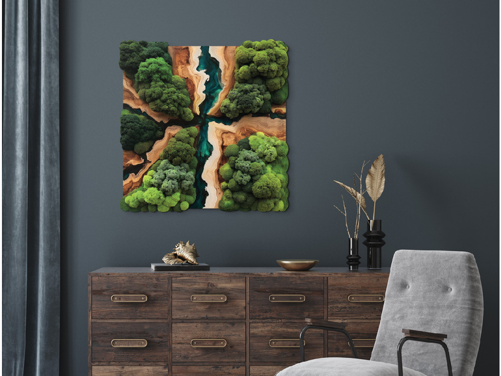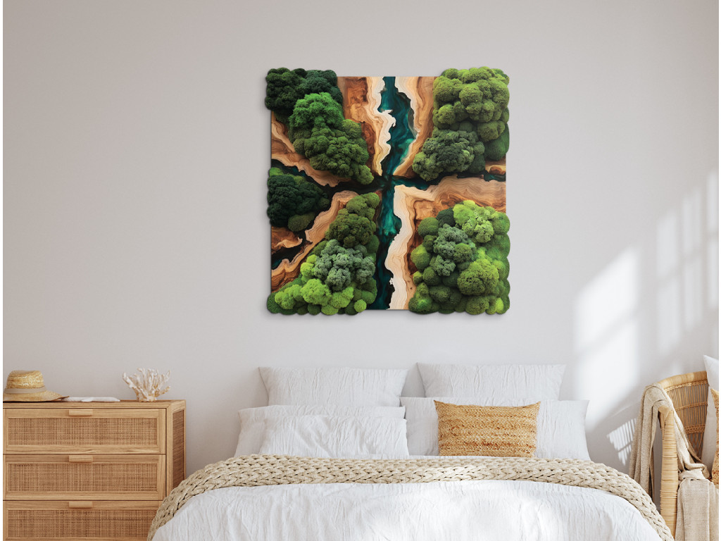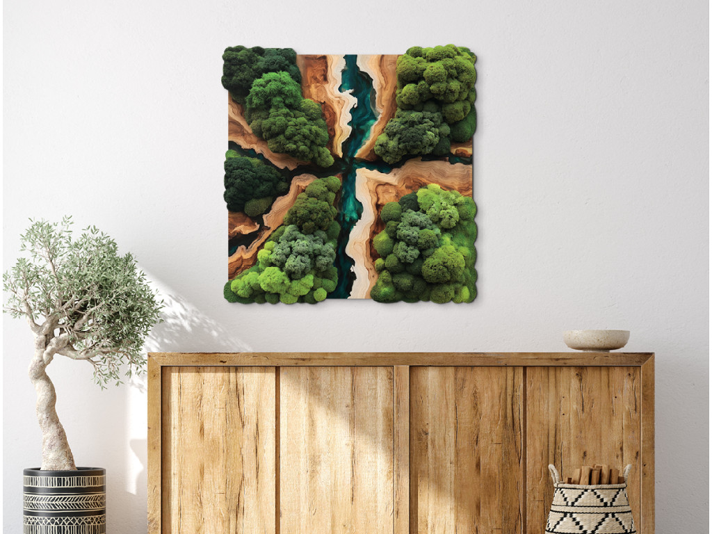 Élvezd a Smaragd meder (UV nyomtatású) mohakép látványát, amely élőnek tűnik öntözés vagy fény nélkül is. A moha és a szemetgyönyörködtető epoxi valósághű utánzata nemcsak megfizethetőbb, de tartósabb is, mint az eredeti. A tered stílusos dizájnelemet kap, hosszú élettartammal és nulla karbantartással. Ez a festmény ideális megoldás egy modern otthonba vagy irodába.