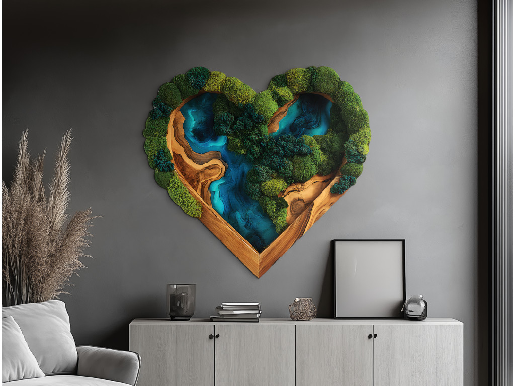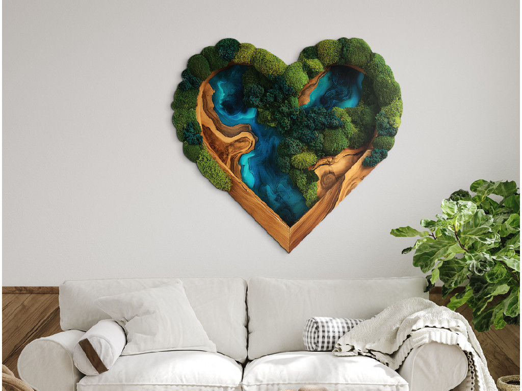 A Szívalakú mohahatású Áramlás (UV‑nyomtatás) élőnek hat, de mégsem igényel öntözést vagy fényt. A moha és a látványos „epoxi” élethű imitációja nemcsak kedvezőbb árú, hanem tartósabb is, mint az eredeti. A tér hosszú élettartamú, karbantartásmentes, stílusos dizájnelemmel gazdagodik. Ideális választás modern otthonba vagy irodába.