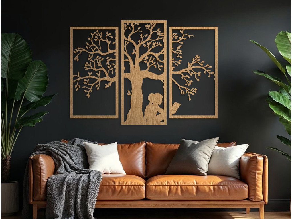 A háromrészes Lány a fa alatt című festmény egy kislányt ábrázol békés környezetben, amint egy virágzó fa alatt pihen. Az elegáns vonalak és a finom részletek harmonikus és nyugtató vizuális hatást keltenek. Ez a művészi elem természetes szépséget és eleganciát kölcsönöz otthonának.