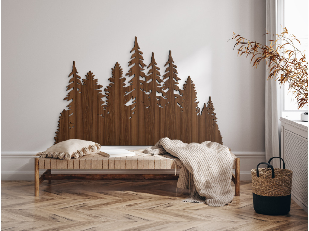 A Sötét erdő fa dekoráció fából készült a drevko műhelyében, precíz részletekre és autentikus megjelenésre helyezve a hangsúlyt. A tűlevelű fák sziluettjei titokzatos, mégis nyugtató hangulatot teremtenek, amely karaktert kölcsönöz a térnek. Egy egyedi darab, amely a faladat az erdő és a hegyek történetévé varázsolja.