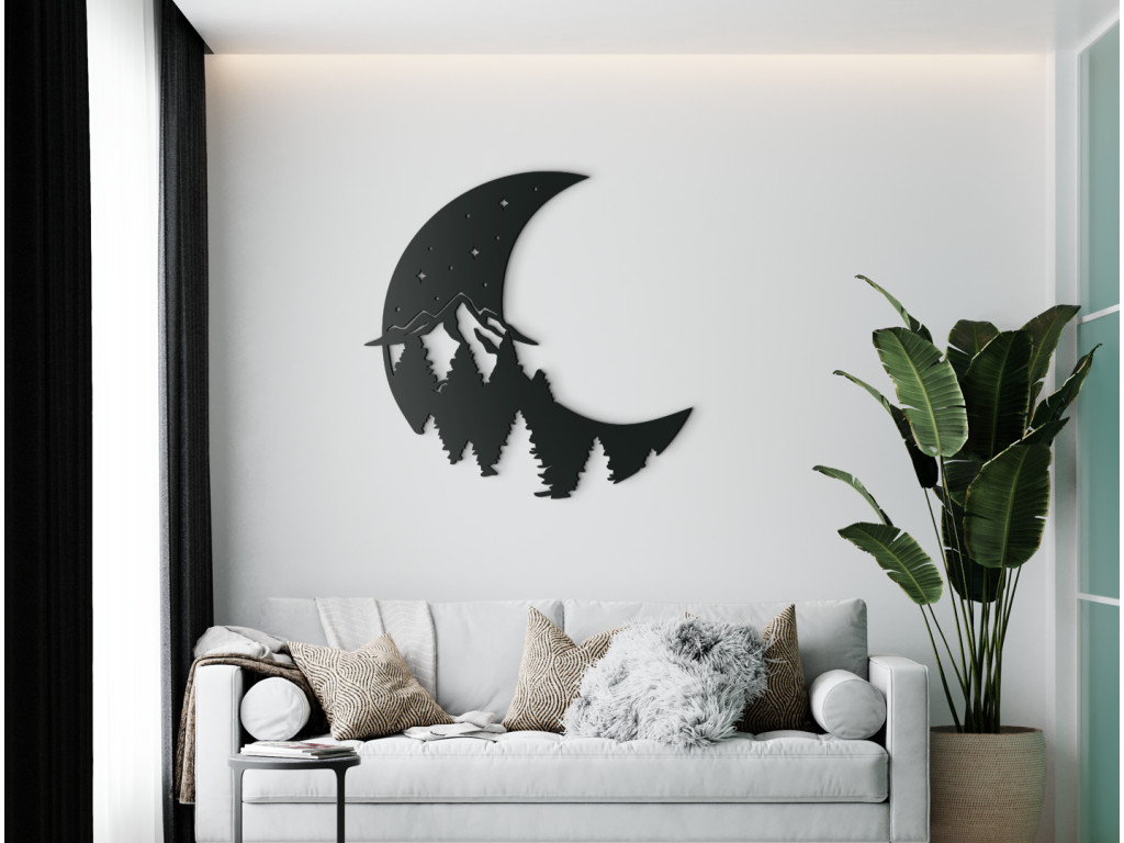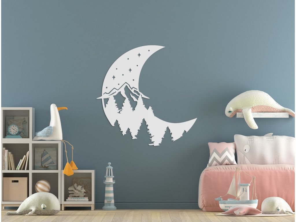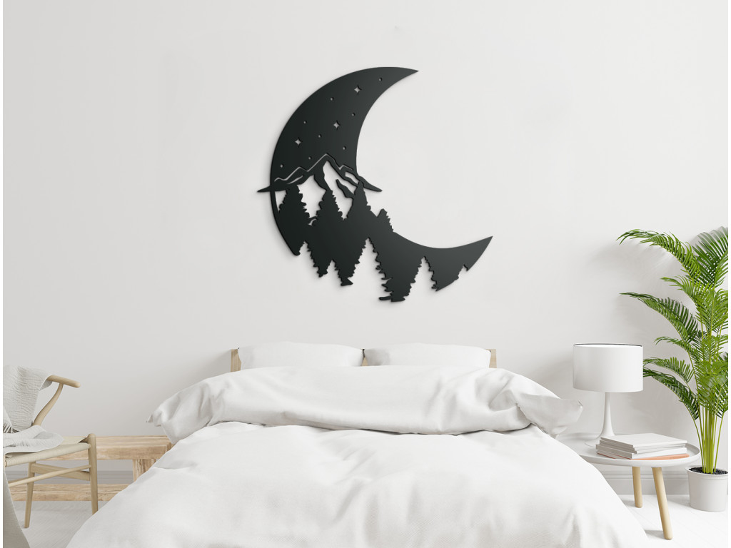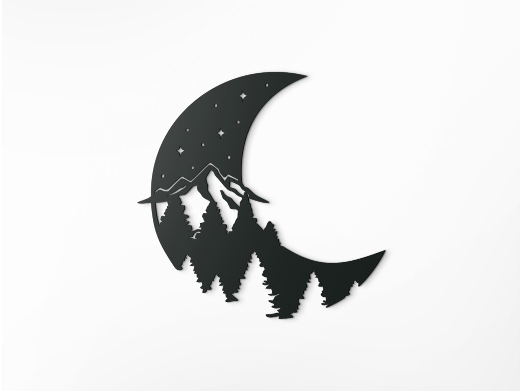 A hegyek szerelmesei számára van egy nem mindennapi képünk - hegyek és erdők a Holdban. A kép nem szokványos megjelenése nagyon stílusosnak tűnik a belső térben. A Hold formájú kép nem megszokott dekoráció lesz az otthonában. Benne egy erdőt talál, amely felett hegyek terülnek el. A csillagok, mint az éjszaka másik jele, e hegyek felett találhatók.
