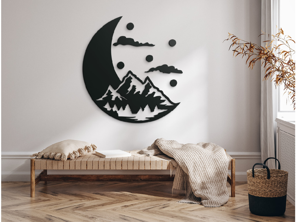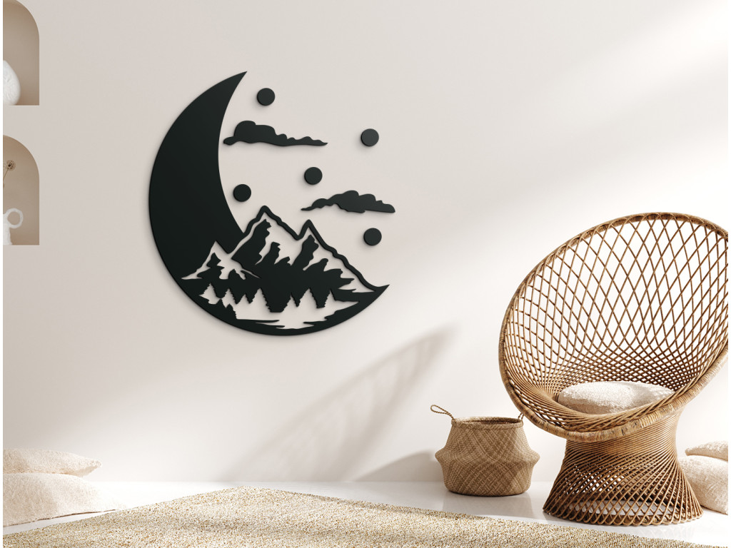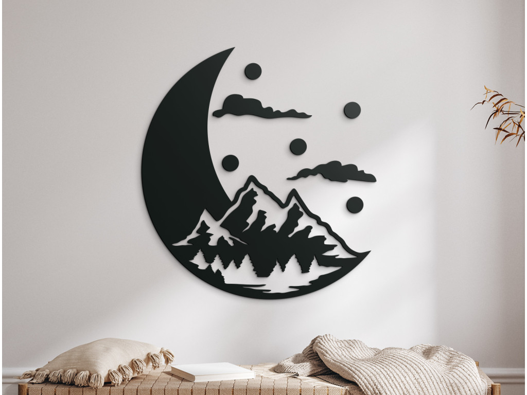 A Hold a hegyek felett fakép a hegyek és az éjszakai égbolt lenyűgöző kombinációját hozza el a térbe egy részletgazdag fa dizájnnal. A lágy vonalak és kontrasztok mélységet és békét teremtenek, amely harmonikusan mutat bármilyen belső térben. Tökéletes a nappaliba, hálószobába vagy dolgozószobába, ahol egyedi és nyugtató hatást kölcsönöz a térnek.