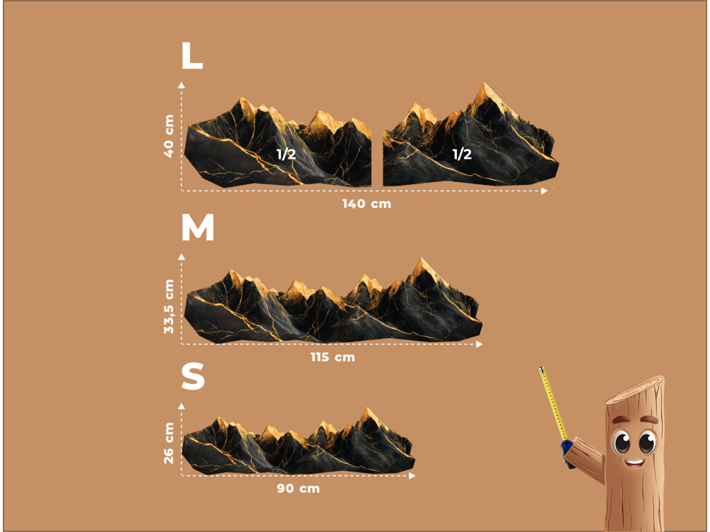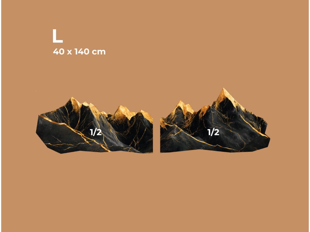 Egy sötét hegyek árnyalataival és aranyerekkel díszített modern kép lenyűgöző fény-árnyék kontrasztot teremt. Az arany vonalak a hegycsúcsokra csapó napsugarakra emlékeztetnek, és fényűző, ragyogó hatást kölcsönöznek a darabnak. Ez az elegáns festmény mélységet, melegséget és kifinomult stílust visz otthonába.