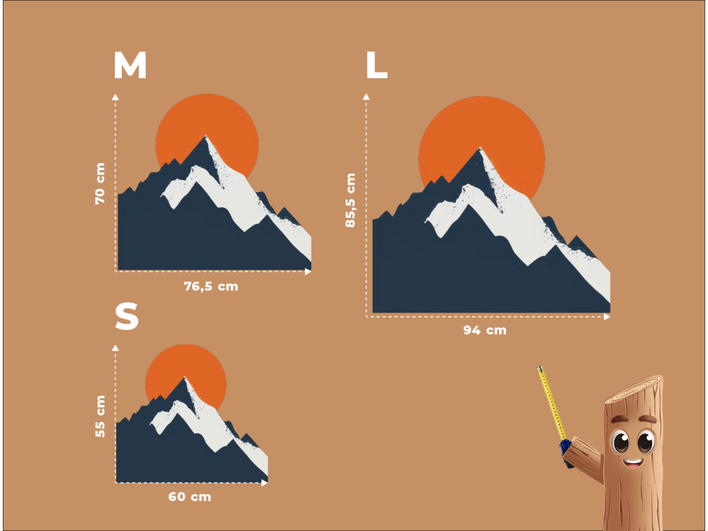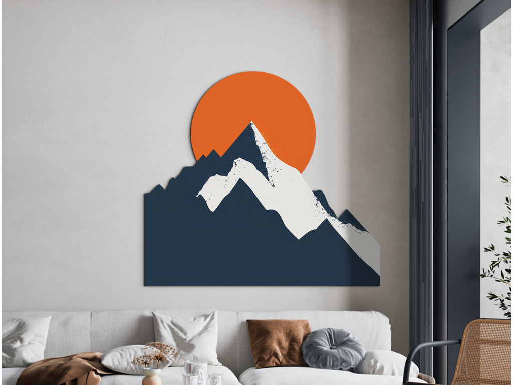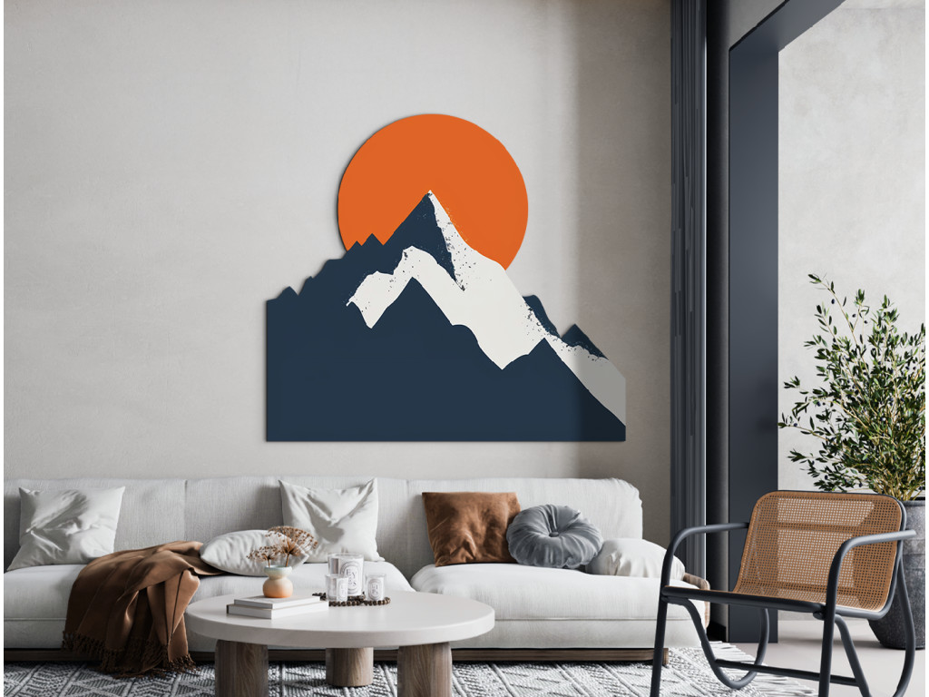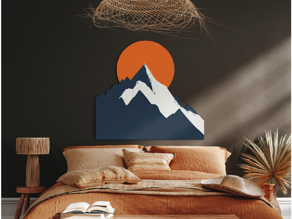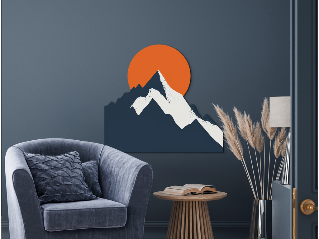 A Nap a hegyek mögött falikép minimalista hegyillusztrációt mutat háttérben a nappal, tiszta és karakteres megjelenéssel, szimbolikus üzenettel. A hegyek az erőt, a kitartást és a célt jelképezik, míg a nap a remény és az új kezdet érzetét adja, letisztult formavilágban. Egyszerűségével és erős üzenetével a természethez való kapcsolódást hangsúlyozza, harmonikus összhanggal.