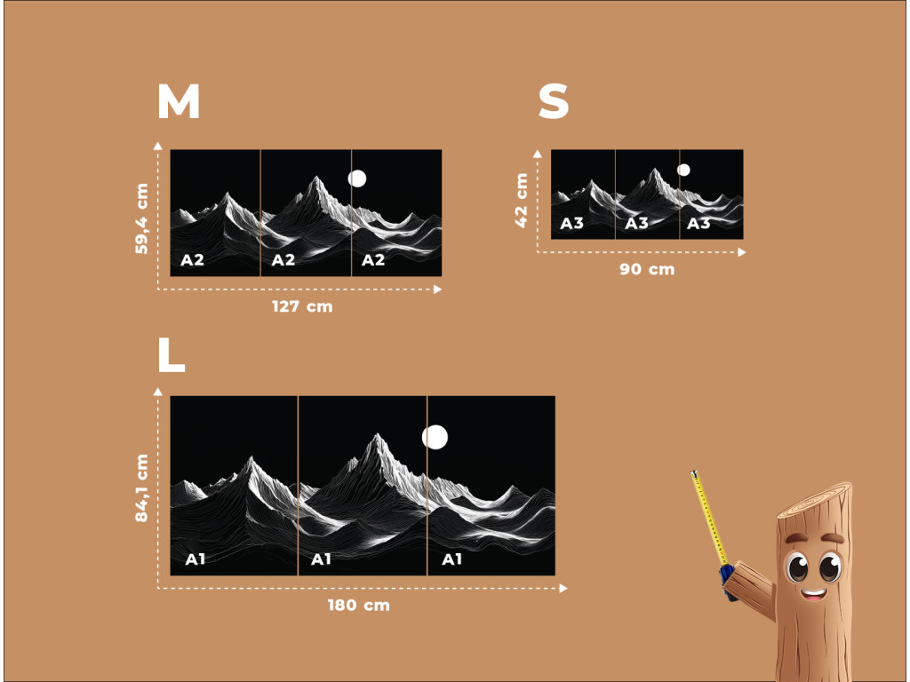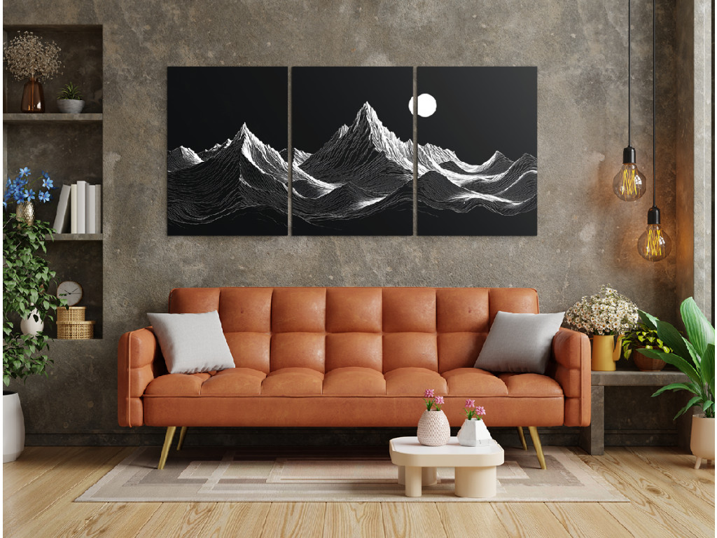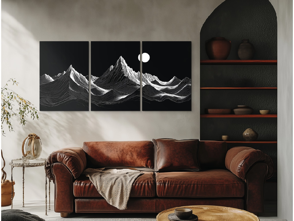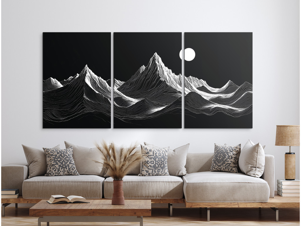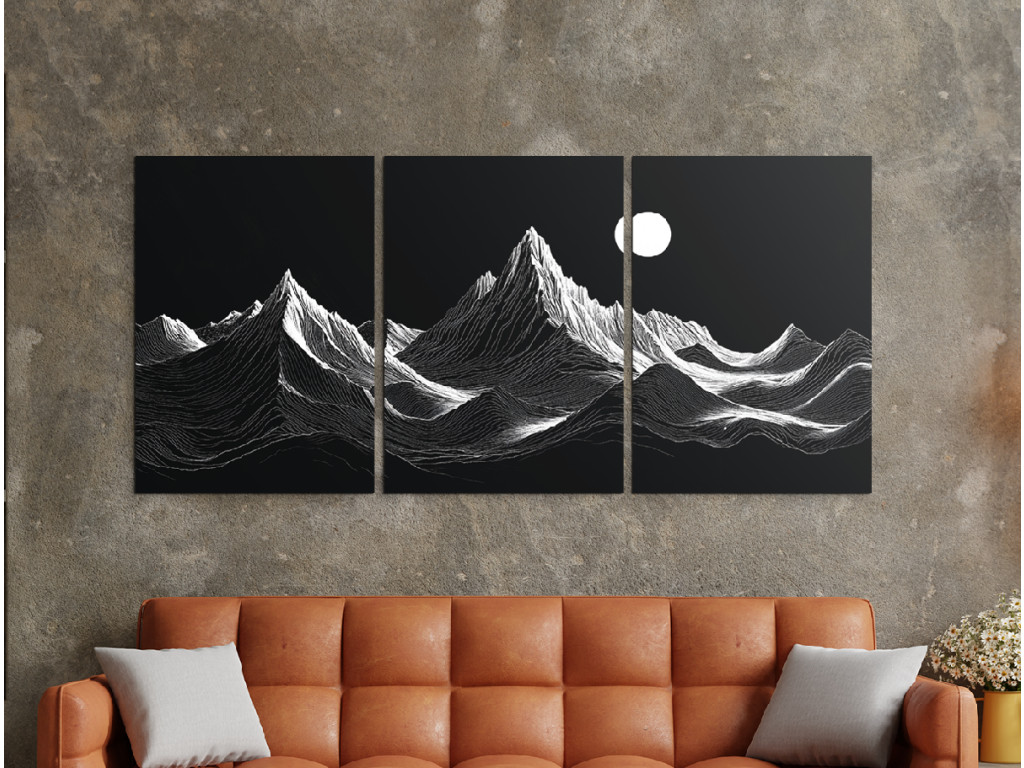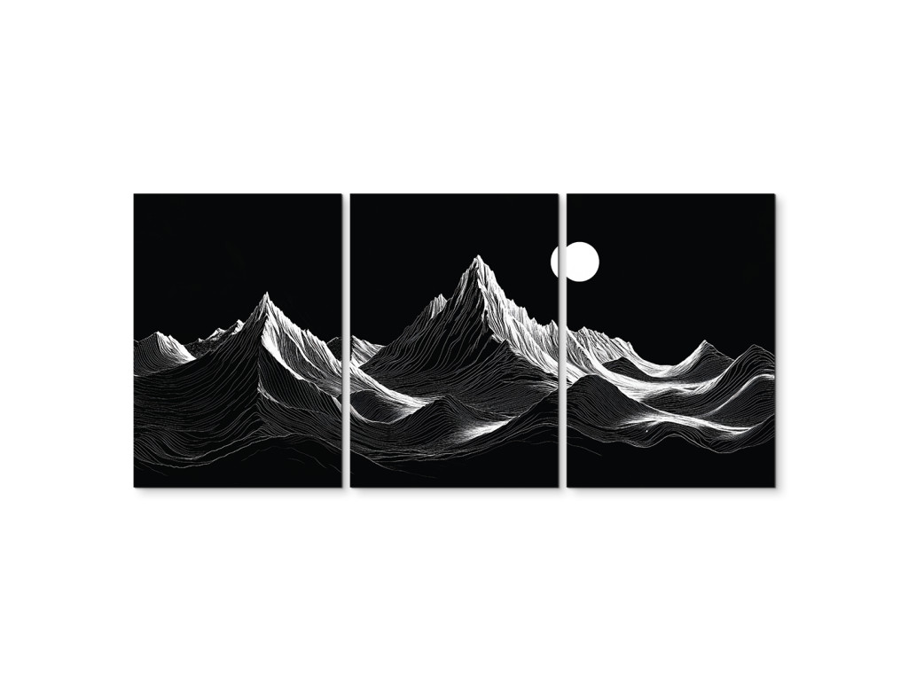 Elegáns, falra akasztható háromrészes kép, amely minimalista fekete-fehér hegy-sziluetteket és holdat ábrázol harmonikus kompozícióban. Minőségi rétegelt lemezből készült, így egyszerre modern és természetközeli dizájnelemként hat. Remekül illik olyan enteriőrökbe, ahol a természetes esztétika, a nyugalom és az egyszerűség dominál.