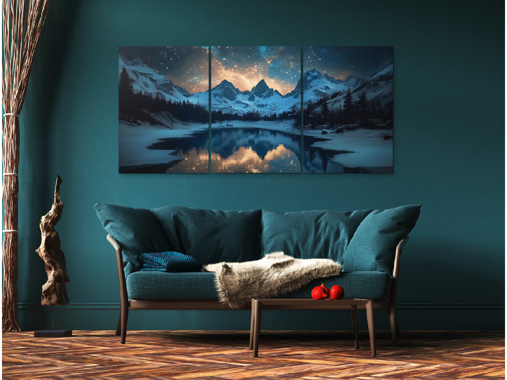 Fenséges, hófödte hegycsúcsok ragyogó éjszakai égbolt alatt, tele csillagokkal és a sarki fényt idéző színes fénnyel, háromrészes képen ábrázolva. Előtérben egy nyugodt tó terül el, amely visszatükrözi a tájat és az eget, partját pedig hóval borított fenyők szegélyezik.
