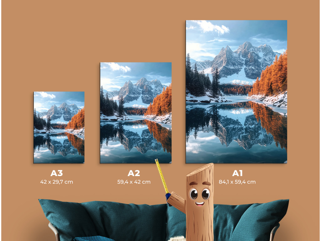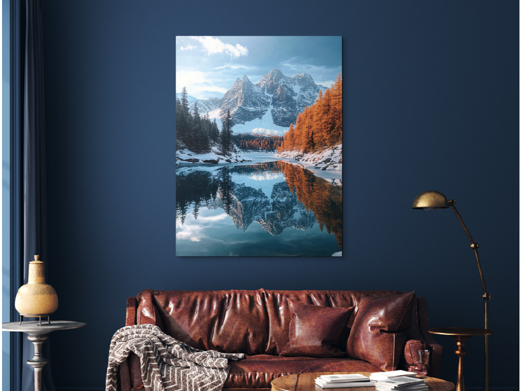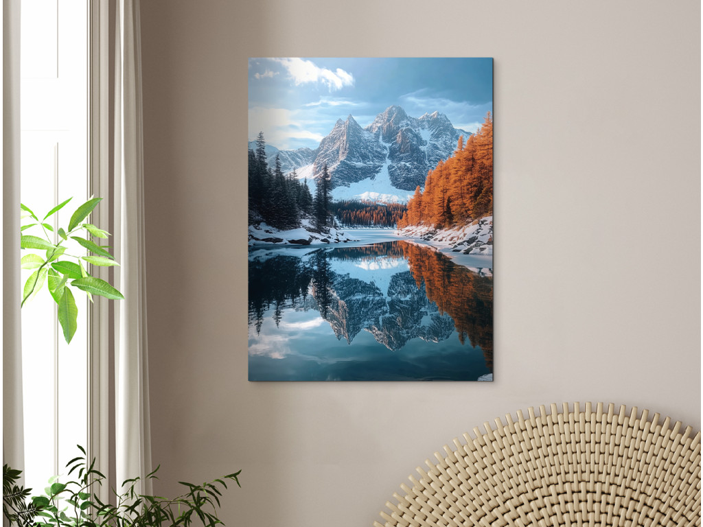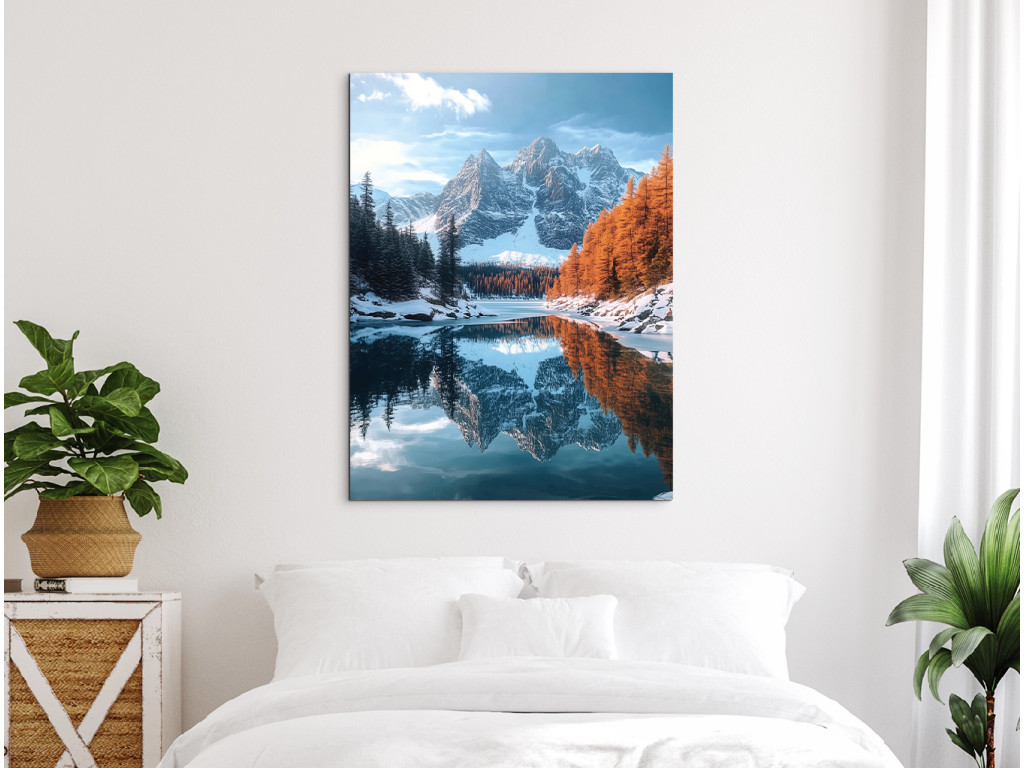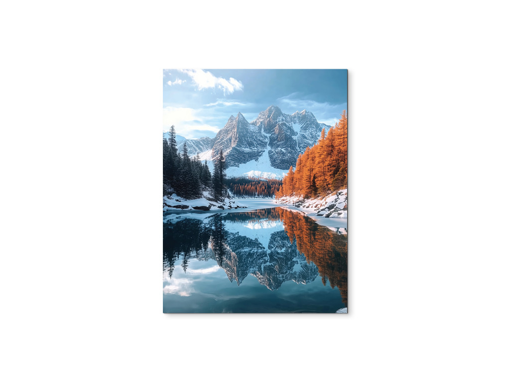A Hideg hegyi tó kép harmonikus tájat ábrázol havas hegycsúcsokkal, fenyvessel és meleg őszi színekbe öltözött fákkal, amelyek nyugodtan tükröződnek a tó sima felszínén. A jelenet kiegyensúlyozott és békés, a finom napfény pedig kiemeli a természet szimmetriájának szépségét és megnyugtató rendjét.
