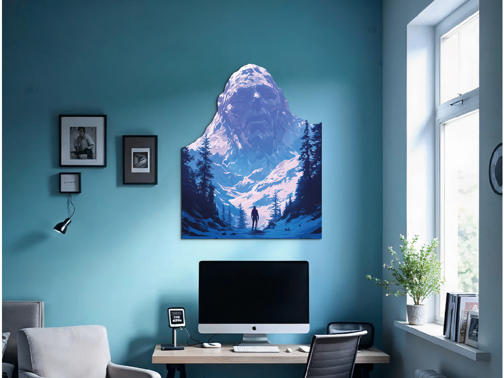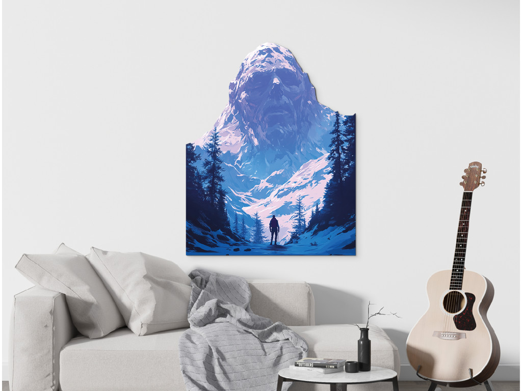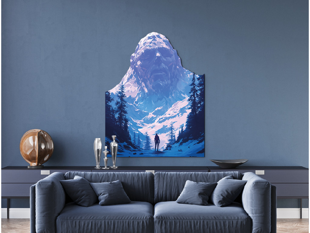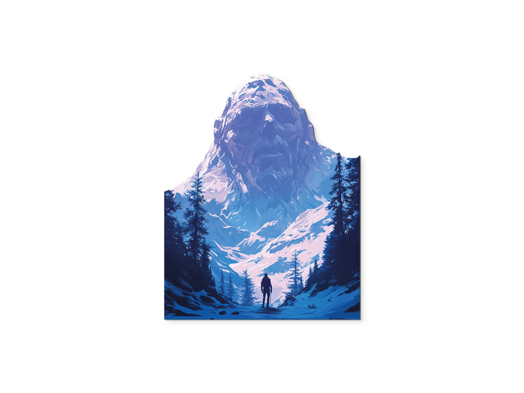 A hegy arca kép művészi illusztráció, amely havas hegyi tájat ábrázol monumentális vonulattal, amelynek formája emberi arcot idéz, elöl magányos alak áll a hegyek közé vezető ösvényen, sötét fenyvesek között, ami a csend és a tisztelet érzetét erősíti. A mű misztikus és szimbolikus hatást kelt – mintha maga a hegy volna az ősi titkok őre, miközben a monumentális forma és a magányos alak felerősíti az időtlenség érzetét.