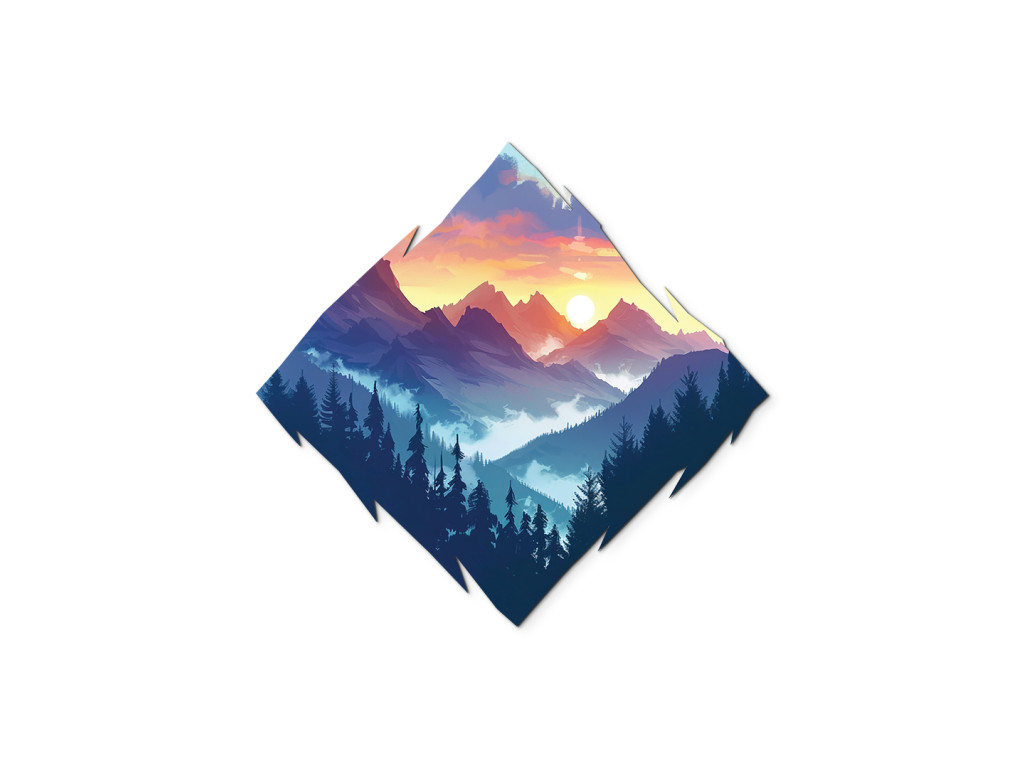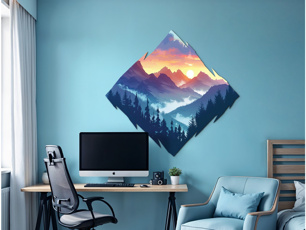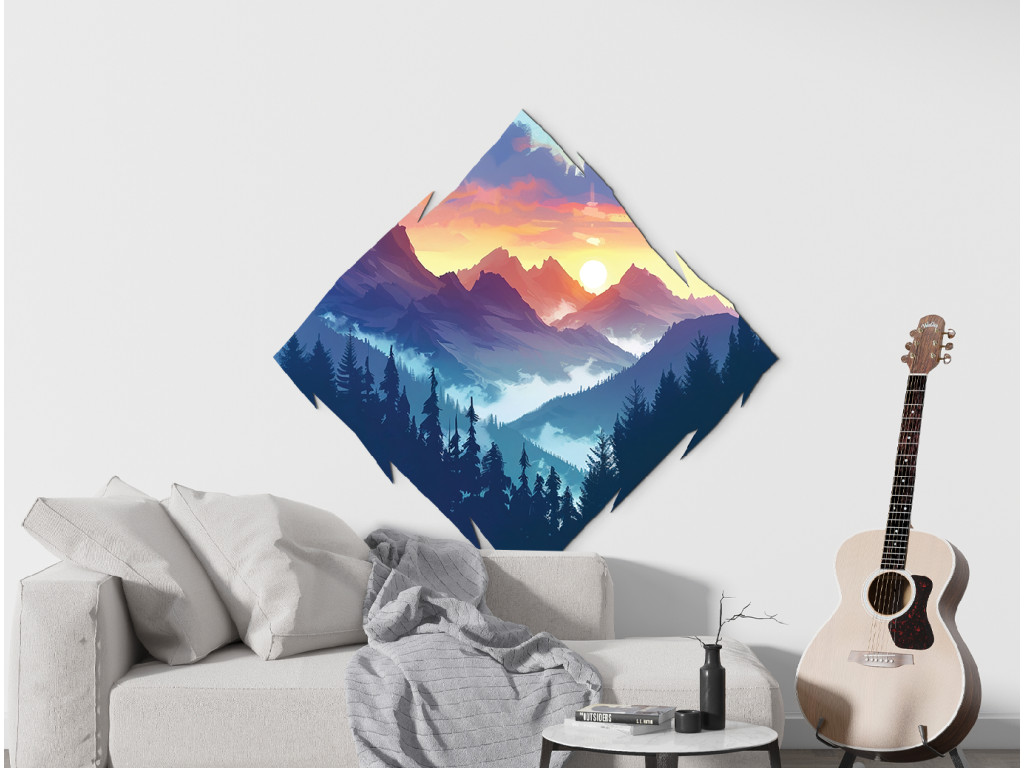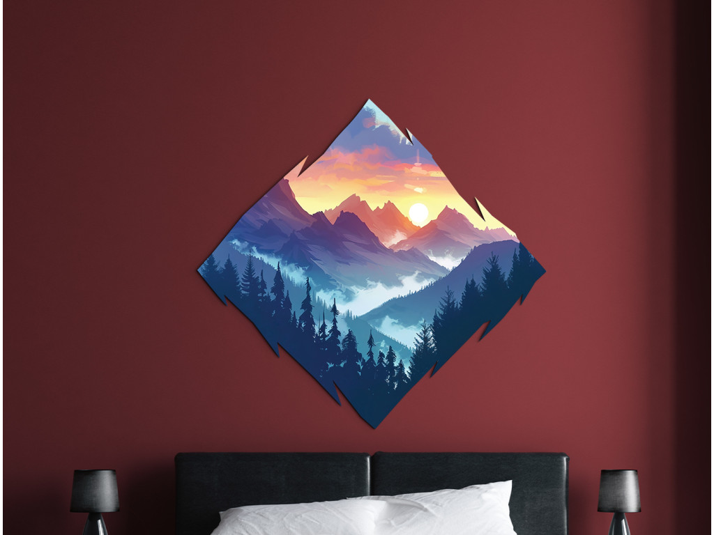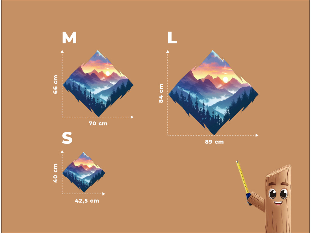 A hegyek csendje nagyméretű, rombusz alakú dekoráció, amely napkelte vagy napnyugta idején mutatja a fenséges hegyláncot. A fenyők és a hegygerincek sziluettjei finom párába vesznek, miközben az égbolt az narancs, rózsaszín és lila meleg árnyalataiban játszik, így a jelenet nyugodt és álomszerű, mint egy meghívás a természet csendjébe való elvonulásra.