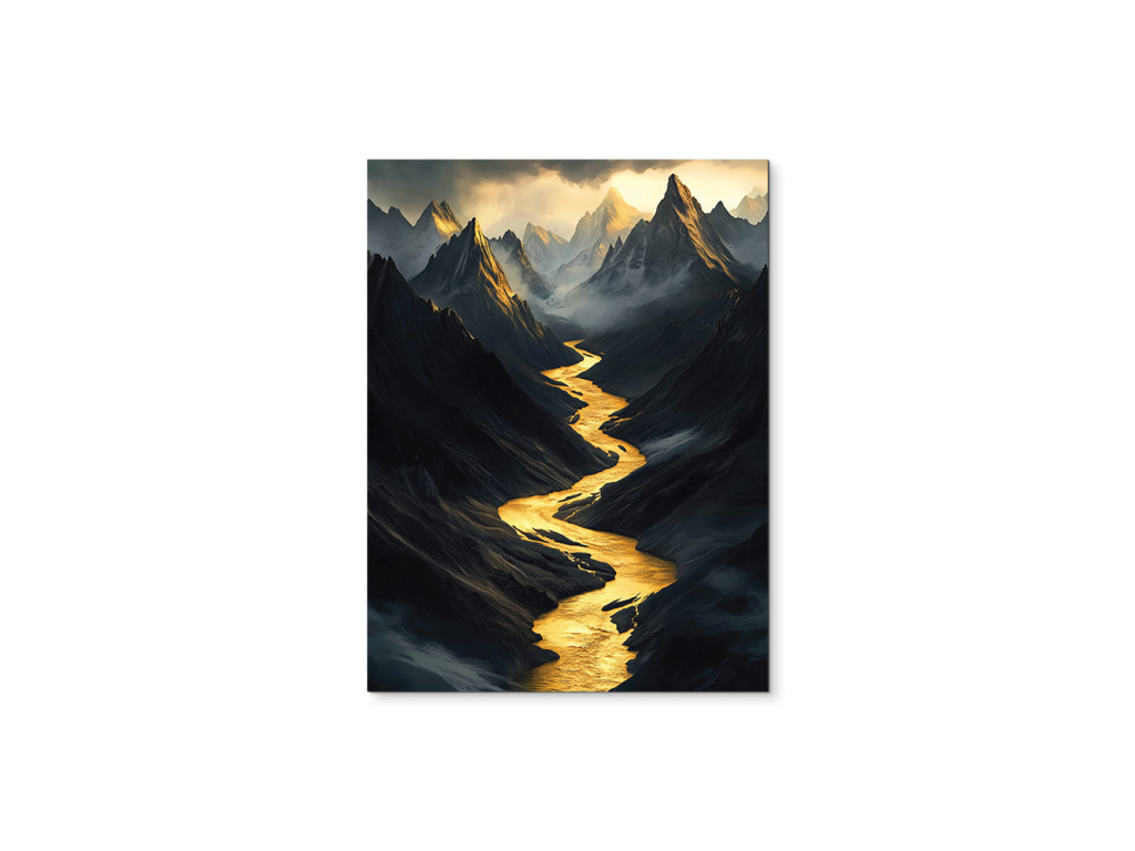 Az Arany folyó völgye kép sötét hegyi tájat jelenít meg, amelyet egy ragyogó, arany színű folyó szel ketté, kígyózva a mély völgyben, mint fény az árnyékban, miközben az éles és titokzatos csúcsok a ködből emelkednek ki, aláhúzva a drámai hangulatot. A sötét tónusok és a ragyogó arany szín közötti kontraszt erőteljes vizuális és érzelmi hatást kelt, egyszerre sugallva mélységet és fenséget.