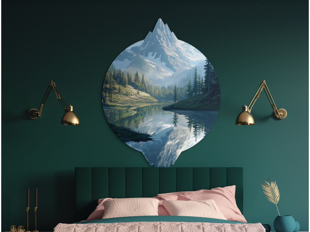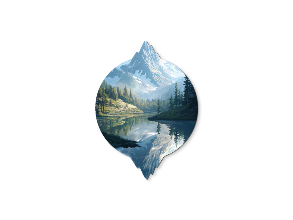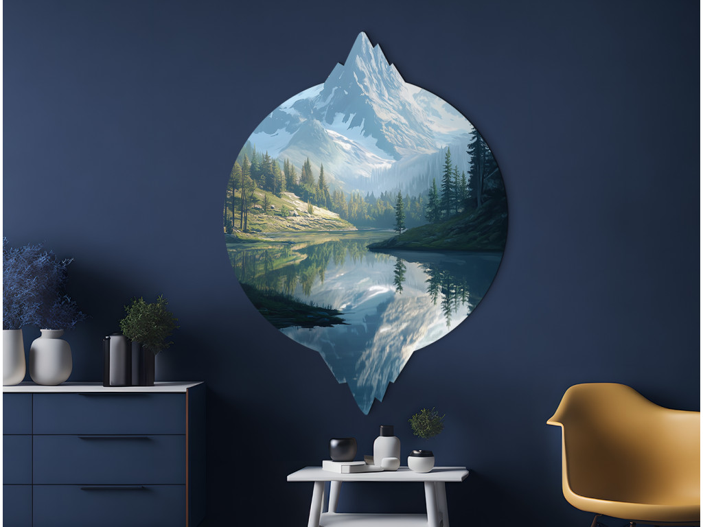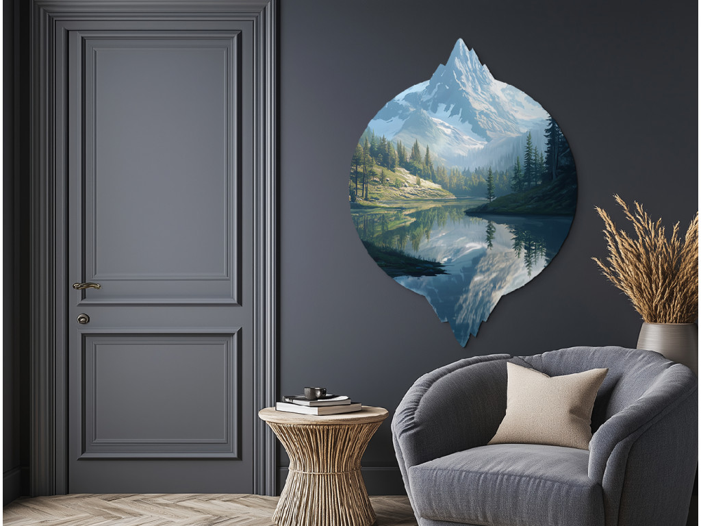 A Béke a hegy tükrében kép egy békés természeti jelenetet örökít meg napnyugta idején, ahol a meleg arany fény elterül a tó felszínén, és a hófödte hegycsúcsok a nap utolsó sugaraiban fürdenek. A kompozíció nyugalmat, lezártságot és harmóniát sugároz, miközben a színek és a fény a csend és az örökkévalóság benyomását keltik.