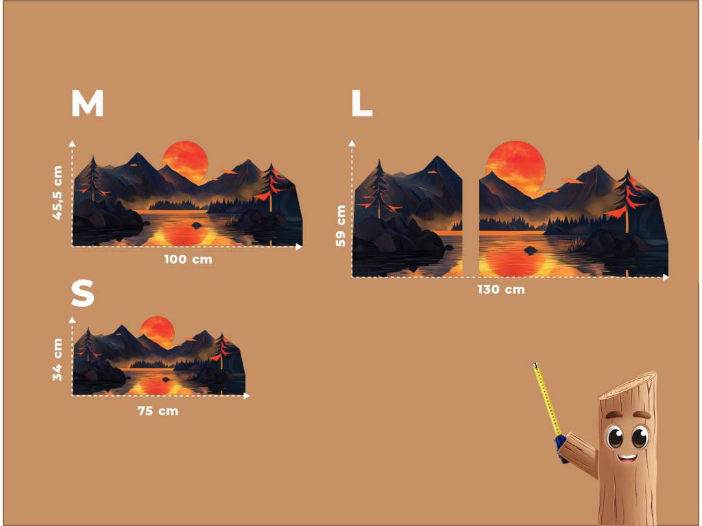 A Napsugaras tükröződések kép dekorációja egy tavi hegyvidéki táj sziluettjét ábrázolja, egy domináns narancssárga nappal, amely visszatükröződik a víz felszínén. A hegyek és fák sötét, kékes-szürke körvonalai kontrasztban állnak az ég meleg színeivel, nyugodt, harmonikus látványt teremtve. A réteges kialakítás térbeliséget és művészi hatást kölcsönöz a képnek, ideális a természetes vagy modern hangulatú belső terekbe.