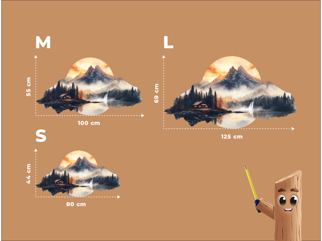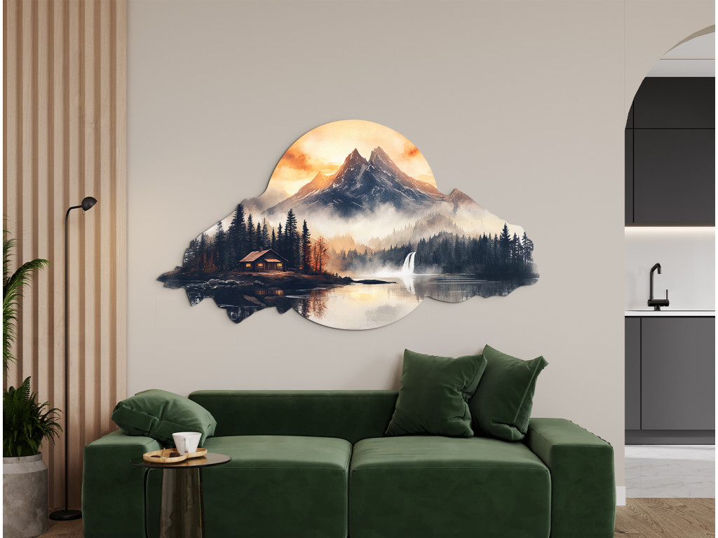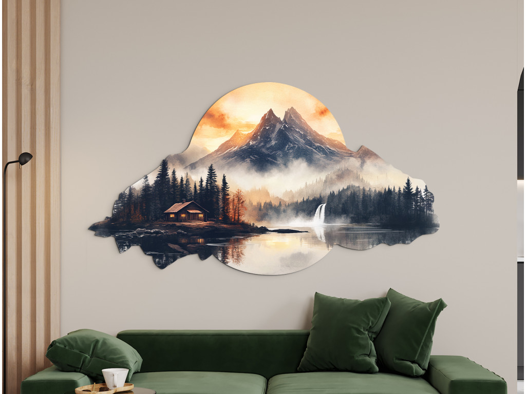 Az „Otthon a hegyek alatt” falikép egy békés hegyi tájat ábrázol egy tóparti házikóval, amelyet sűrű tűlevelű erdő vesz körül. A távolban ködbe burkolózó hegyek magasodnak, míg a jobb oldalon egy vízesés mozgást és életet kölcsönöz a jelenetnek. Az égbolton a narancssárga és sárga meleg árnyalatai hajnalt vagy alkonyatot sugallnak, a felhőre vagy dombra emlékeztető szabálytalan, organikus keret pedig azt a benyomást erősíti, hogy ez egy emlék, egy álom vagy egy természeti paradicsomba való menekülés.