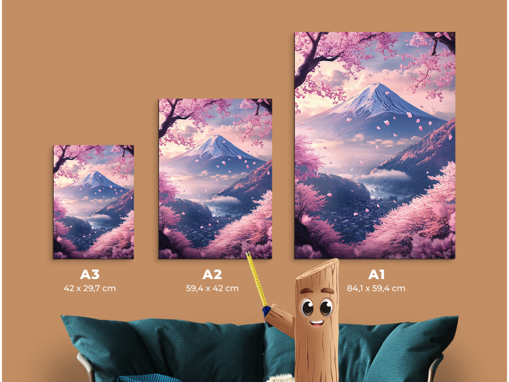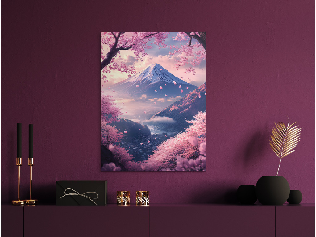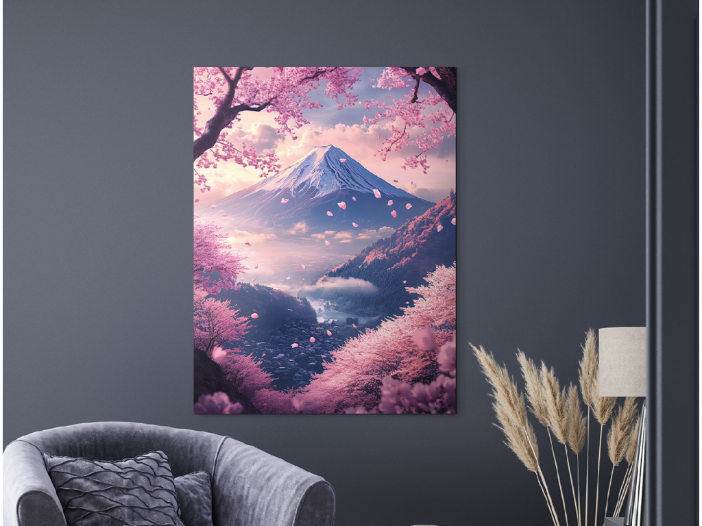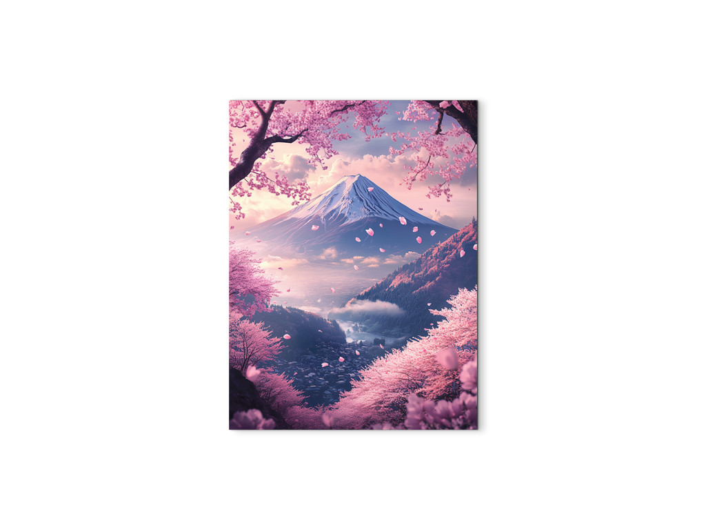A Romantikus Fuji kép az ikonikus Fudzsi hegyet ábrázolja virágzó cseresznyefákkal körülvéve, amelyek finom rózsaszínnel töltik meg a jelenetet. A hulló szirmok és a ködös háttér álomszerű hangulatot teremtenek, amely a japán természet nyugalmát és törékeny szépségét fejezi ki.