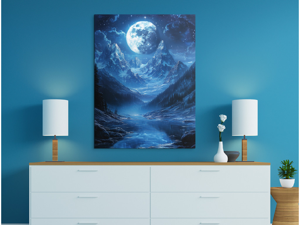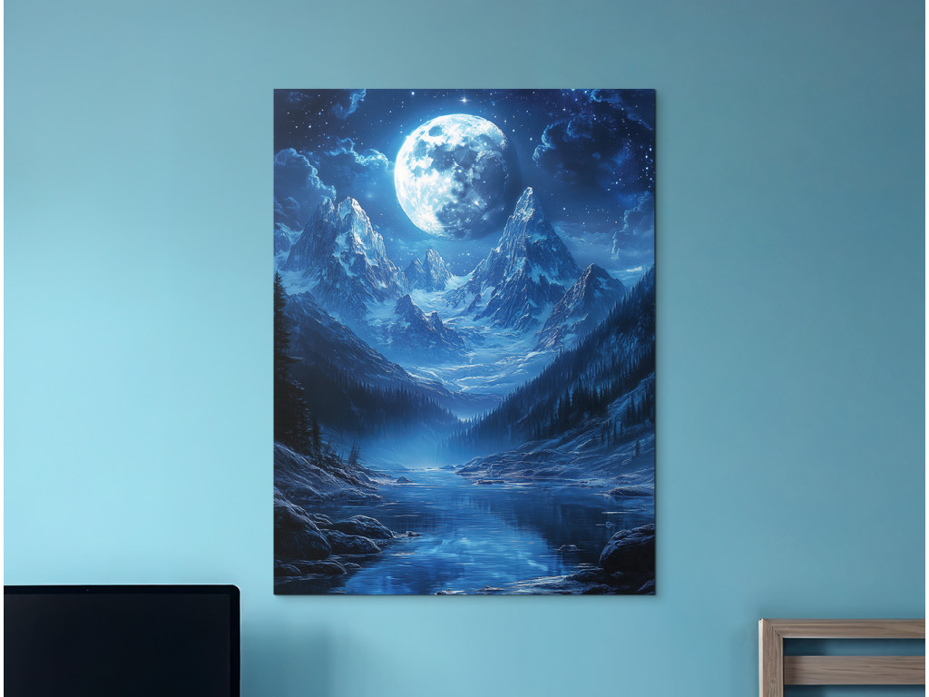 A Telihold a csendes völgy felett kép egy lenyűgöző éjszakai jelenetet örökít meg egy havas hegyi táj felett ragyogó teliholddal. A völgyben egy tó vagy folyó tükröződik, ami felerősíti a kompozíció nyugalmát és mélységét. A kép hangulata titokzatosságot és belső békét sugároz, ami a telihold varázslatos erejére jellemző.