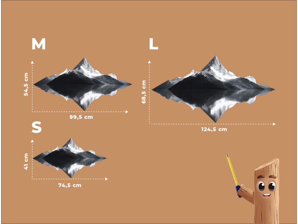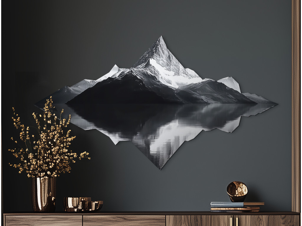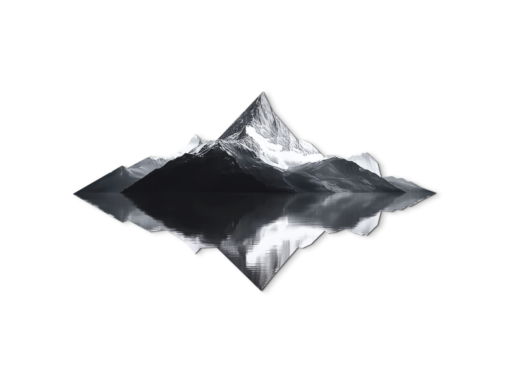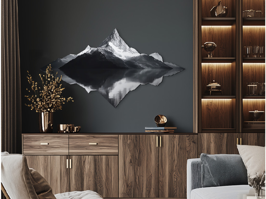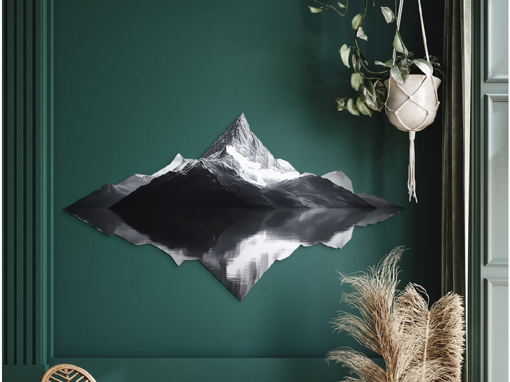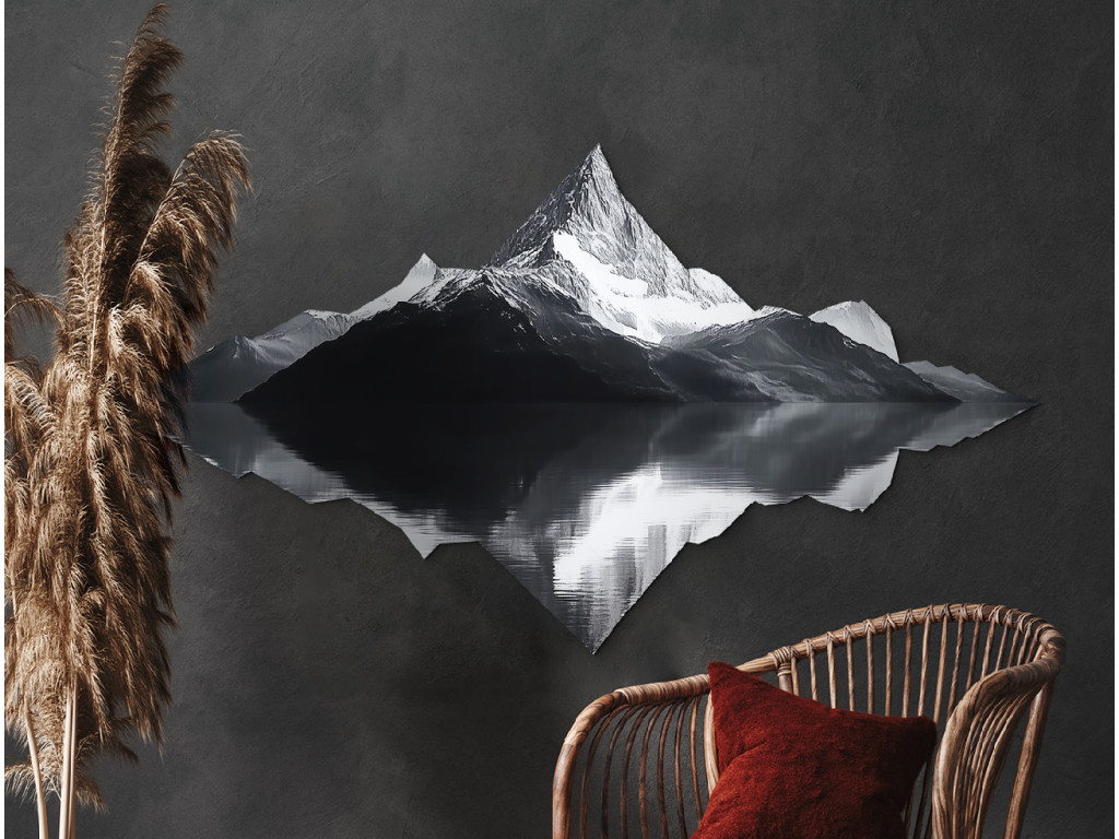 A minimalista műalkotás egy fenséges hegy szimmetrikus tükörképét ábrázolja a vízben, a természet vizuális tükrét alkotva. A fekete-fehér design a valóság és a kép közötti kontrasztot hangsúlyozza, az erőt, a stabilitást és a belső belátást szimbolizálva. A kép tiszta, kiegyensúlyozott és meditatív hatású – ideális elegáns faldekorációként.
