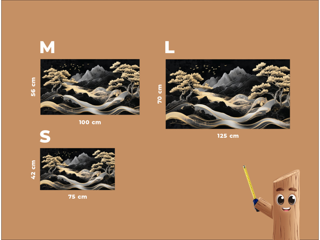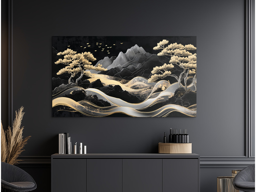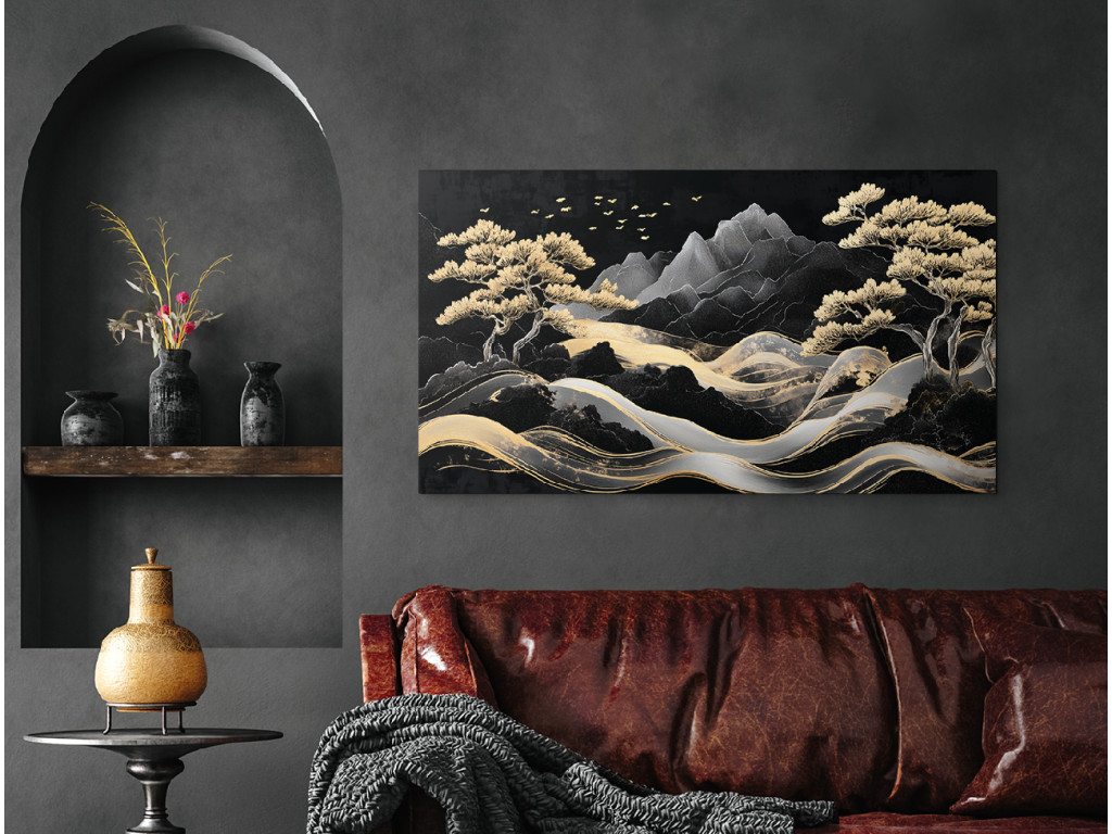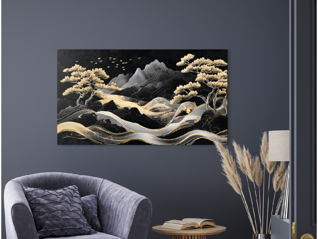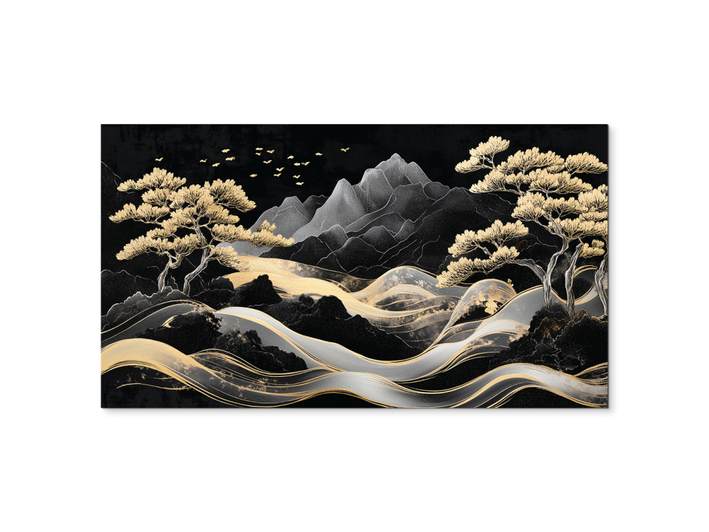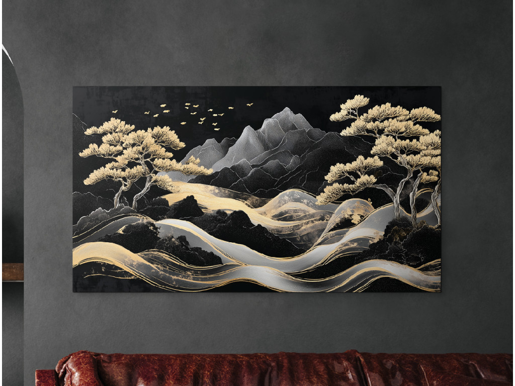A festmény egy harmonikus hegyvidéki tájat ragad meg elegáns, aranyló fákkal és egy kanyargós ösvénnyel vagy folyóval, amely a kompozíció közepén fut. A háttérben látható stilizált sötét hegyek a repülő madarakkal együtt nyugodt és nemes vizuális élményt nyújtanak, ázsiai esztétika beütéssel.