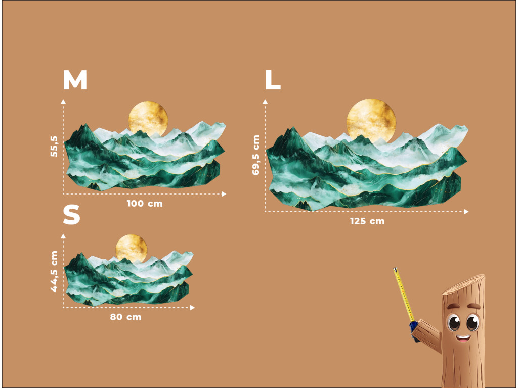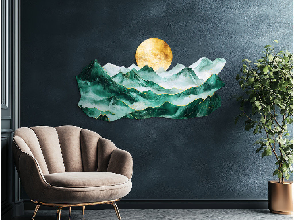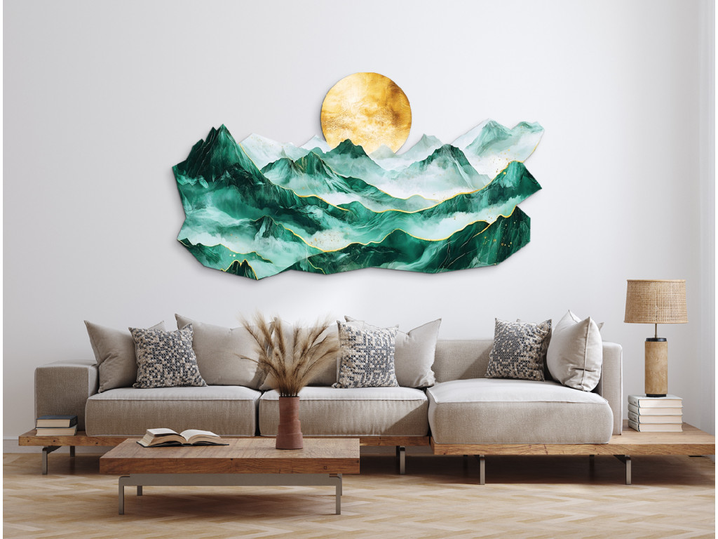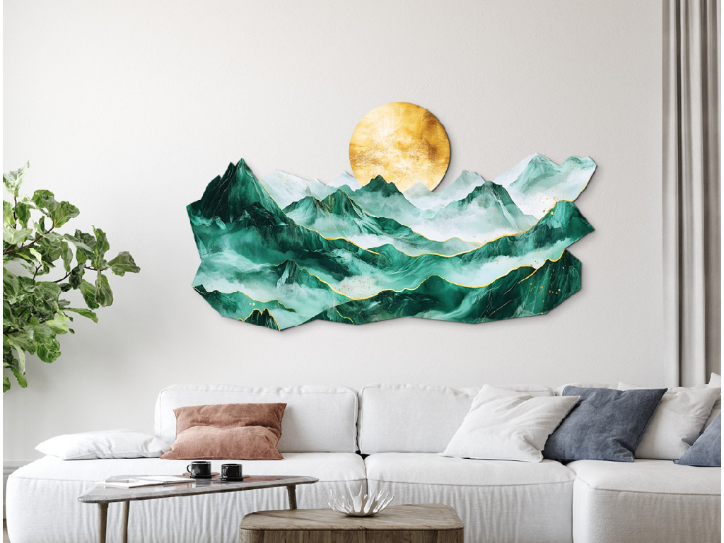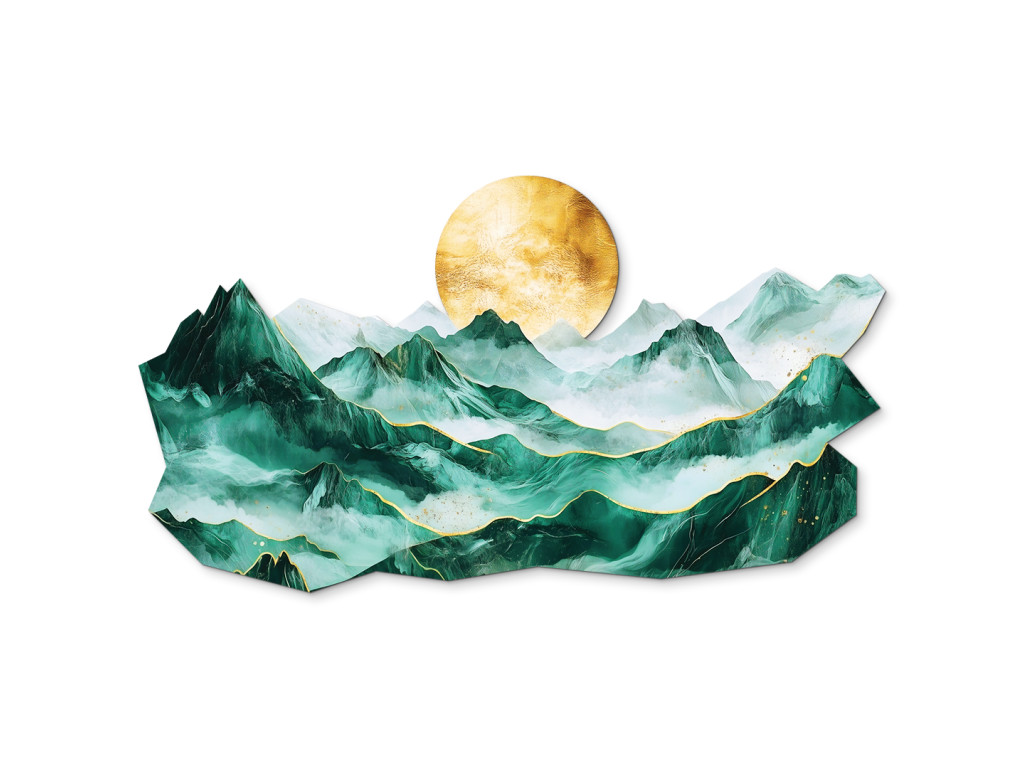 Elegantný obraz s motívom hôr v odtieňoch tyrkysovej, bielej a zlatej zachytáva harmóniu medzi prírodou a moderným umením. Zlatý kruh v pozadí, symbolizujúci slnko alebo mesiac, dodáva obrazu luxusný nádych a hĺbku. Ideálny doplnok pre interiér, ktorý túži po pokojnej atmosfére s dotykom elegancie.