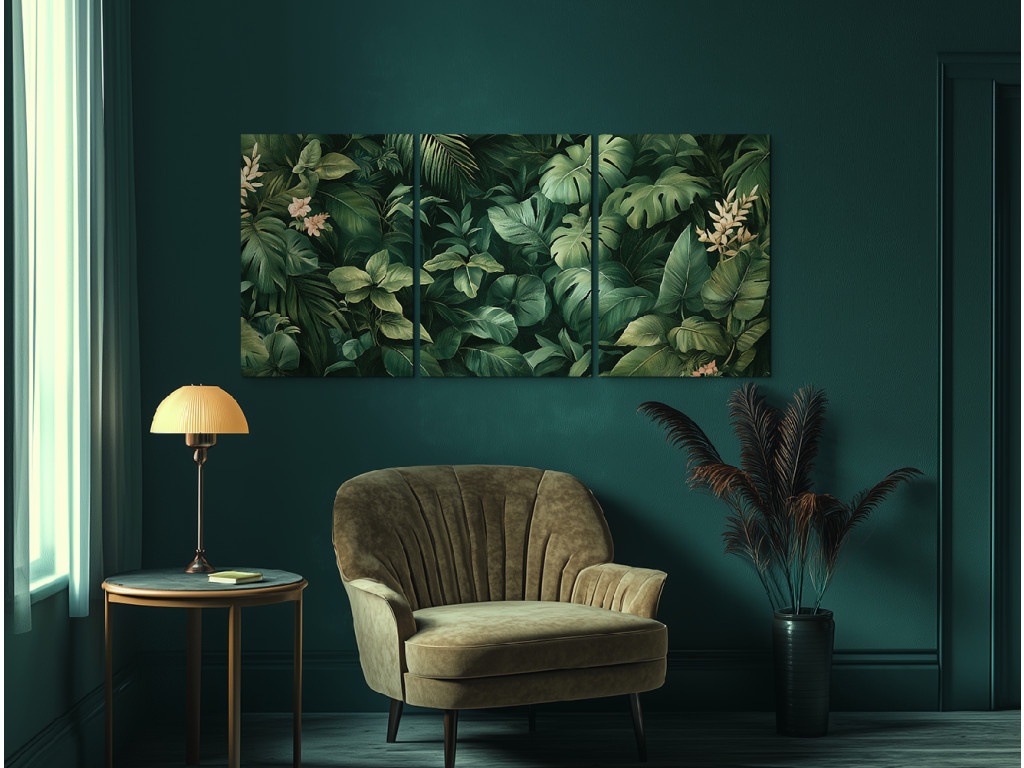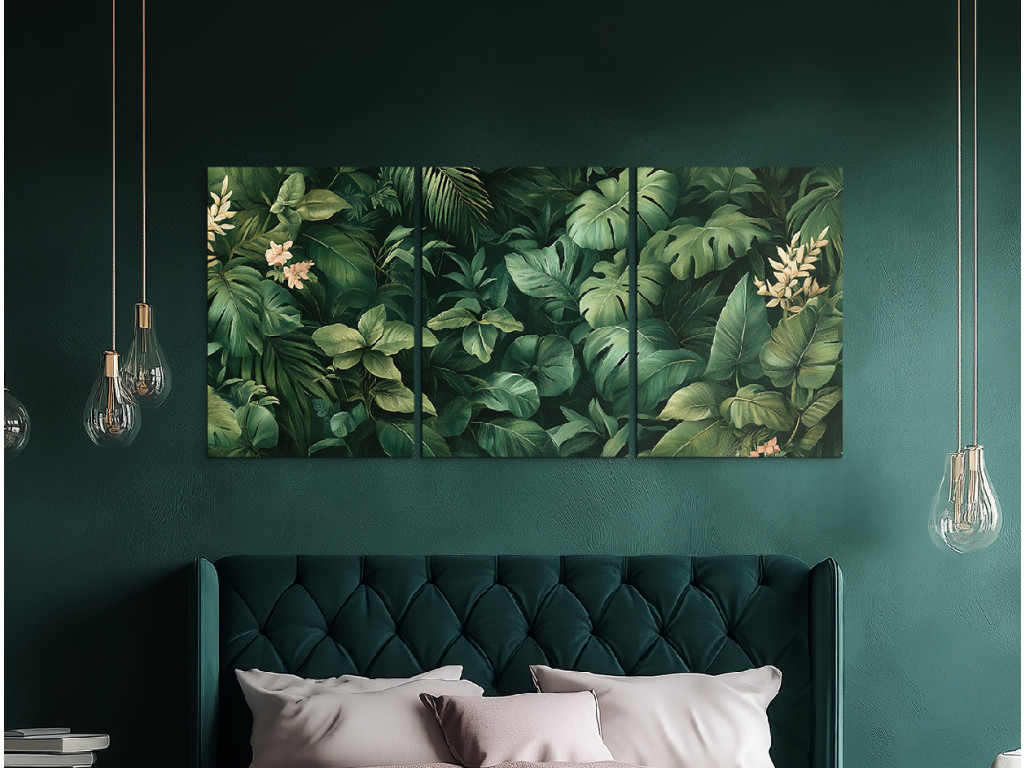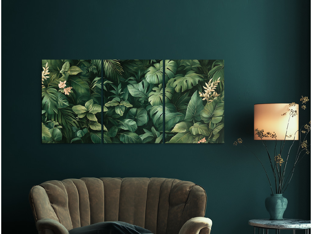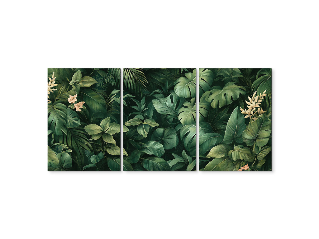 A Trópusi oázis egy háromrészes kép, amely a trópusi természet frissességét hozza be a térbe, három felületen átívelő zöld levelek formájában. A zöld árnyalatainak finom játéka egyszerre nyugtató és üdítő hatású. Remekül mutat nagyobb falon a nappaliban, az étkezőben vagy a télikertben.