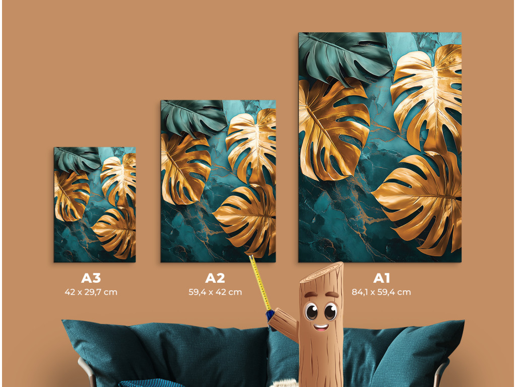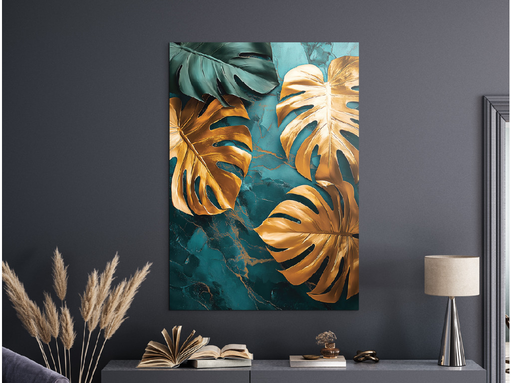 Az Arany könnyezőpálma kép fényes arany leveleivel vonzza a tekintetet. A levelei kontrasztot alkotnak a smaragdzöld-márványos háttérrel. A luxus és a természet ötvözete exkluzív, ugyanakkor harmonikus hatást kelt.