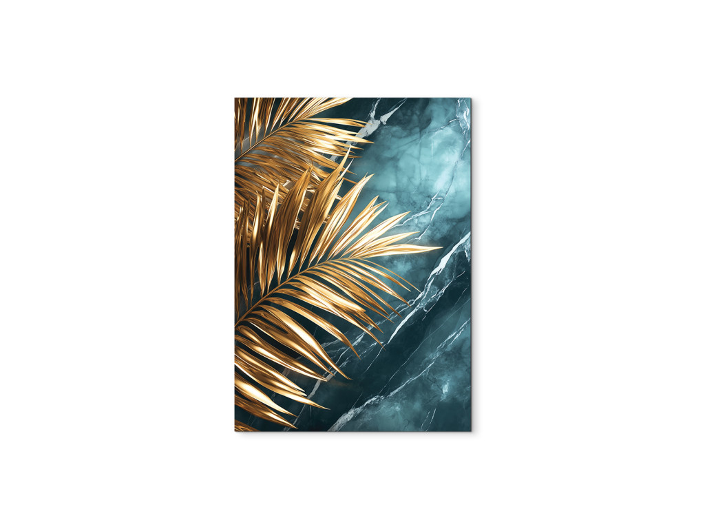 Az Arany pálmalevél kép luxus és időtlen hatást kelt a fényes levél és a smaragdzöld márvány háttér közötti erős kontrasztnak köszönhetően. Ez az elegáns kép egy csipetnyi egzotikumot és kifinomultságot kölcsönöz a térnek. Kiválóan mutat a falon egy dolgozószobában, előszobában vagy egy modern hangulatú nappaliban.