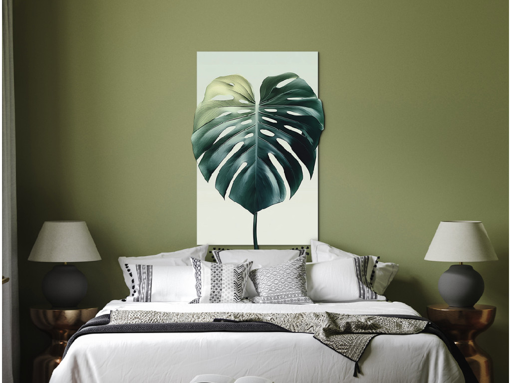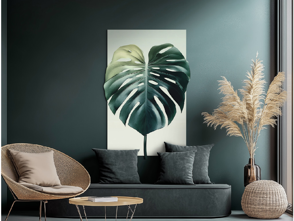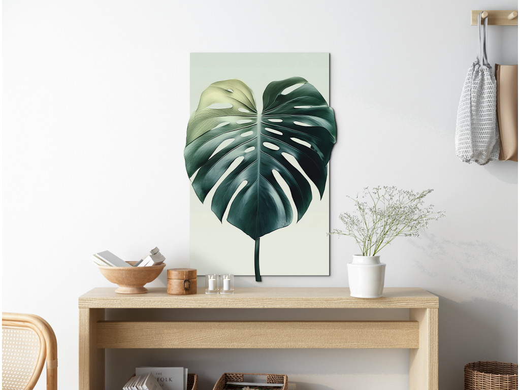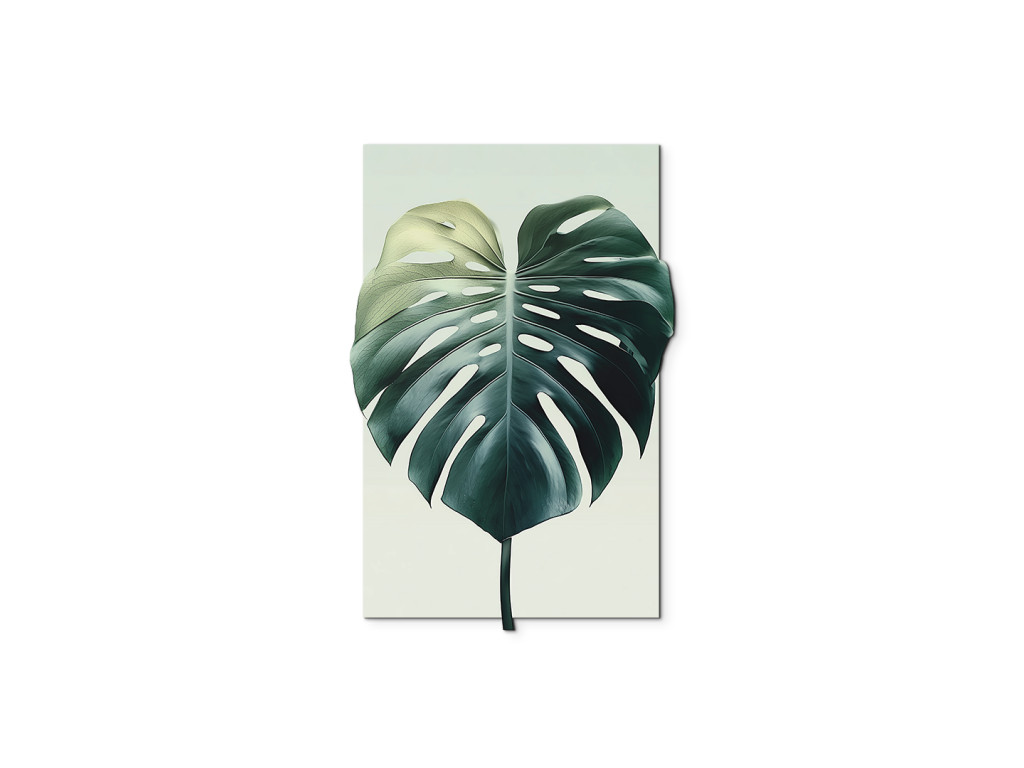 A festmény sötétzöld árnyalatokban ábrázolja az ikonikus monsztera levelet, kiemelve természetes bevágásait és lyukait, amelyek egyedi formát adnak neki. A világos háttér kiemeli a levél fő vizuális elemét, és kiemeli trópusi és modern jellegét. Elegáns és letisztult motívum, ideális belső dekorációként, a természetre és a dizájn egyszerűségére helyezve a hangsúlyt.