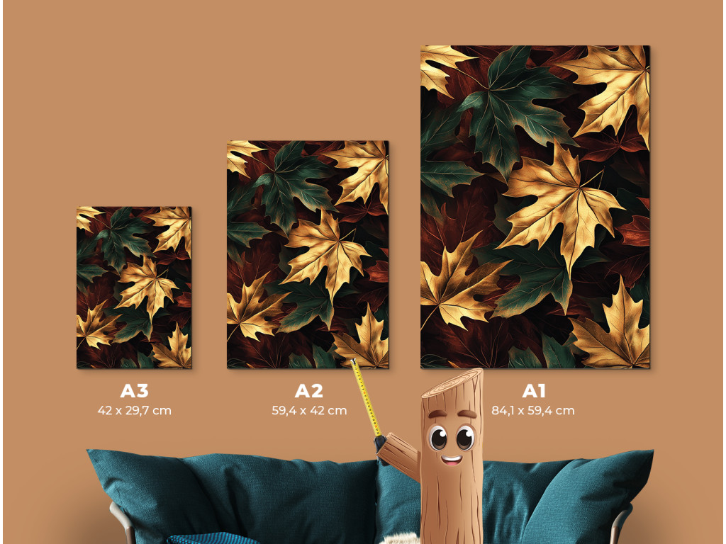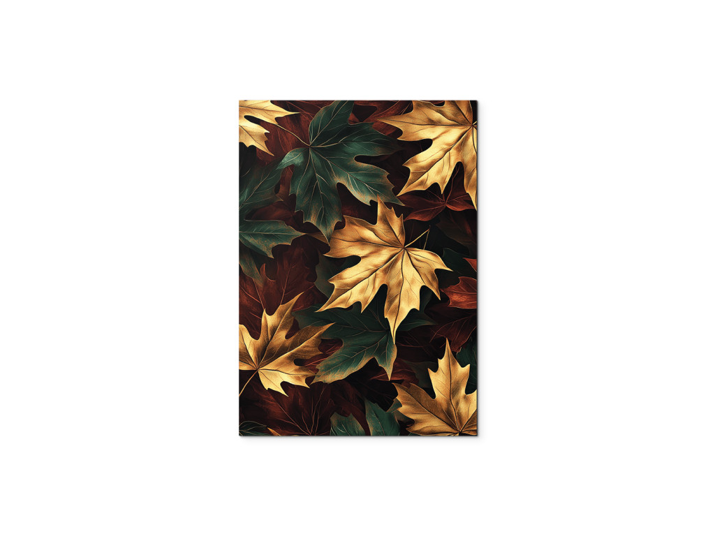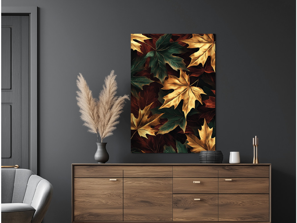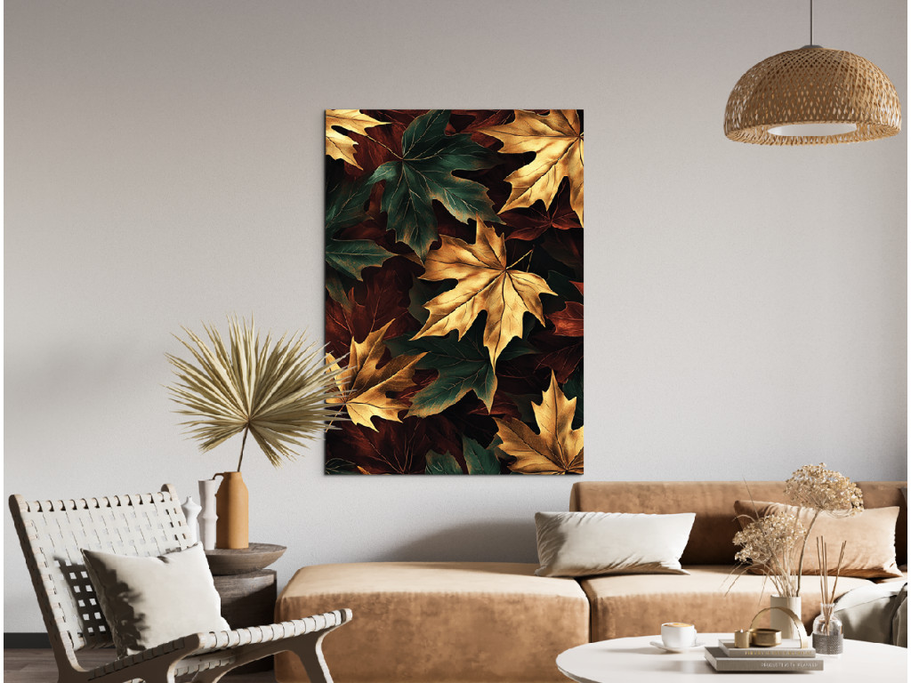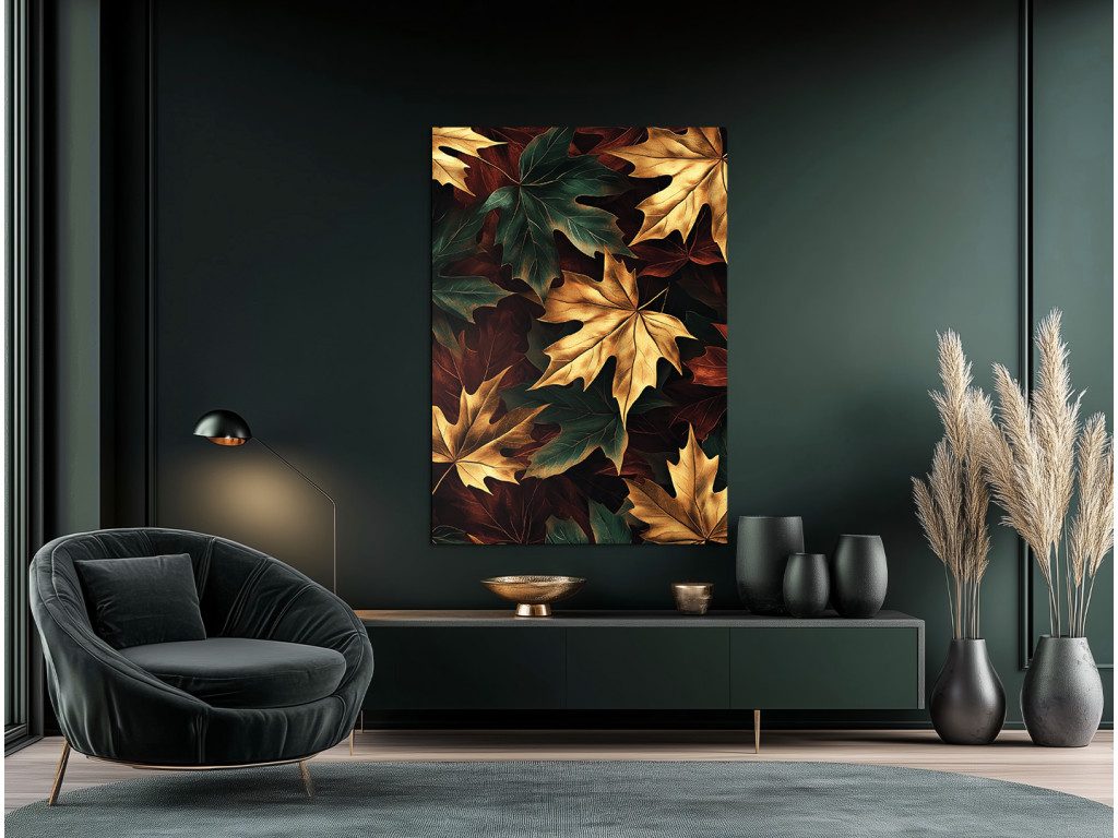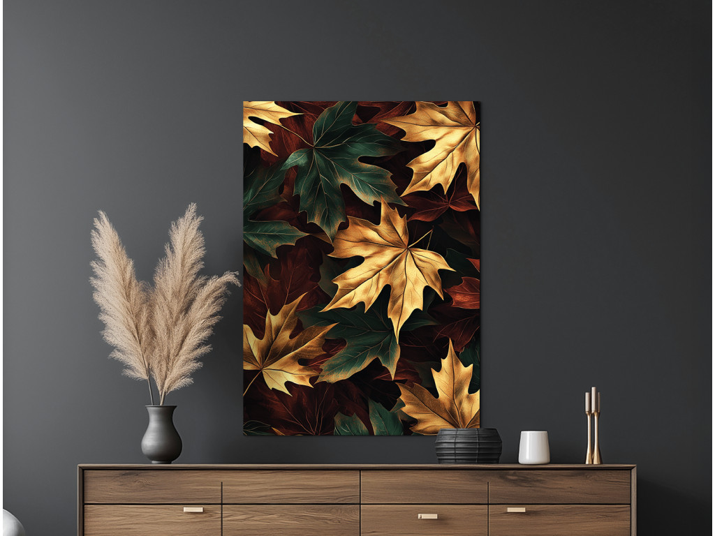 Az Őszi juharfa egy modern kép, amely a színes ősz szépségét ragadja meg a juharleveleken keresztül sárga, arany, sötétzöld, fekete és narancssárga árnyalatokban. A sötét háttér lehetővé teszi, hogy a gazdag színpaletta kiemelkedjen, és meleg, mégis elegáns hangulatot teremt. Nagyszerű kiegészítője lehet egy nappalinak, előszobának vagy természetes elemekkel teli enteriőrnek.