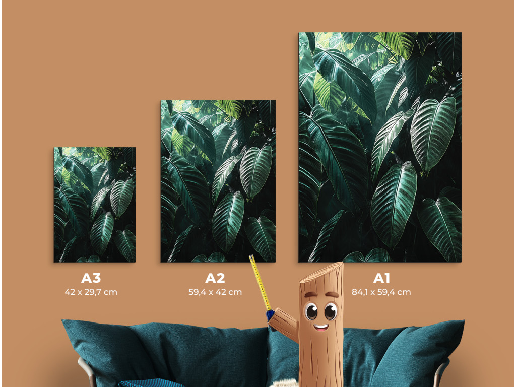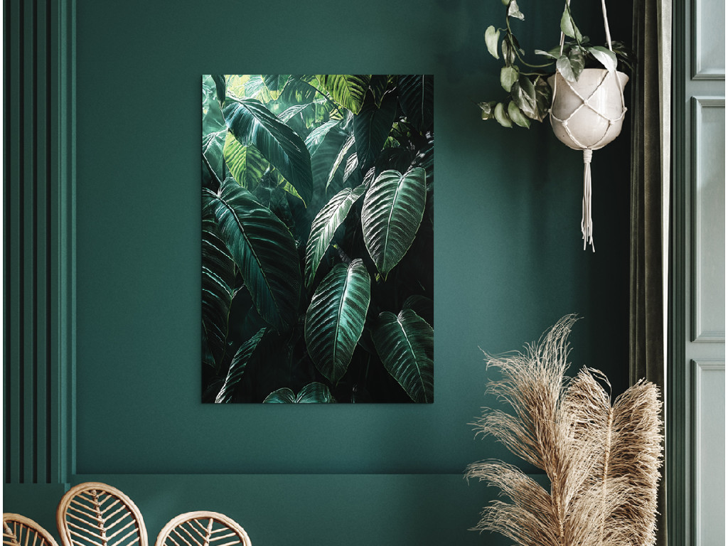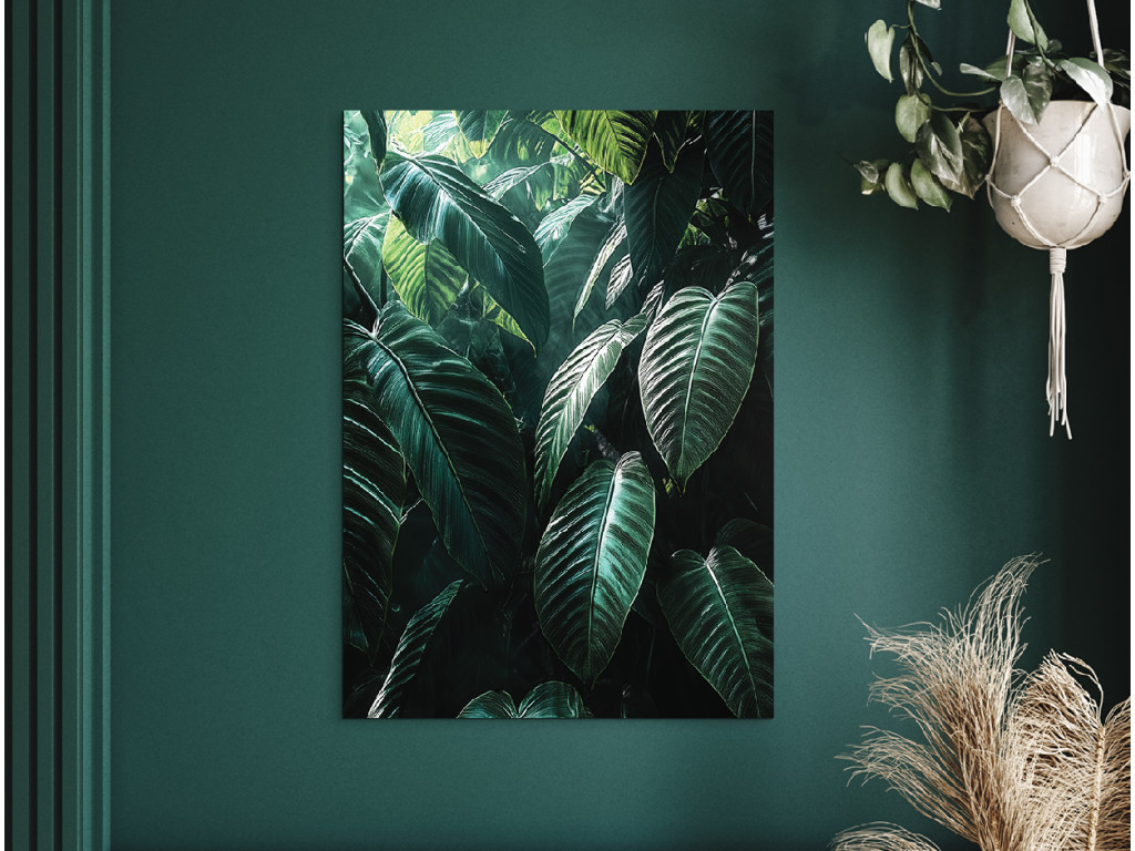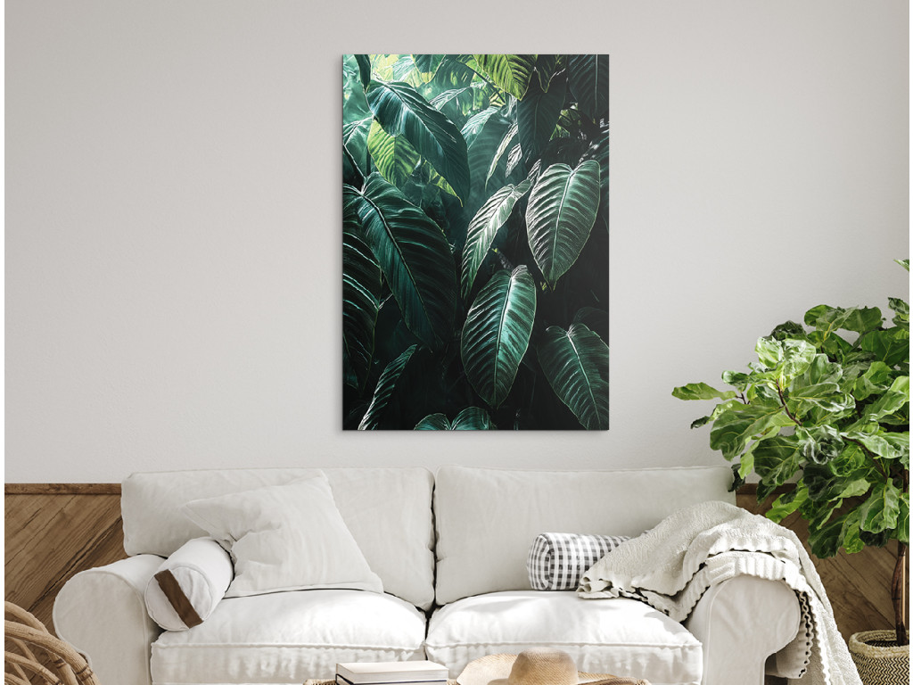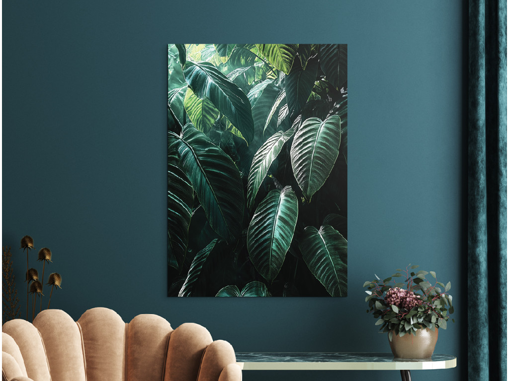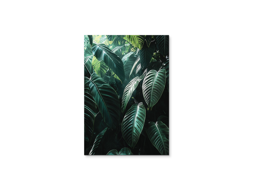 A Trópusi zöld levelek kép frissességgel és egzotikummal tölti meg a teret, miközben a ragyogó levelek és az árnyékos háttér modern, letisztult összhatást keltenek. Remek választás nappali, dolgozószoba vagy téli kert falára, ahol a természet közelsége érezhetővé válik.