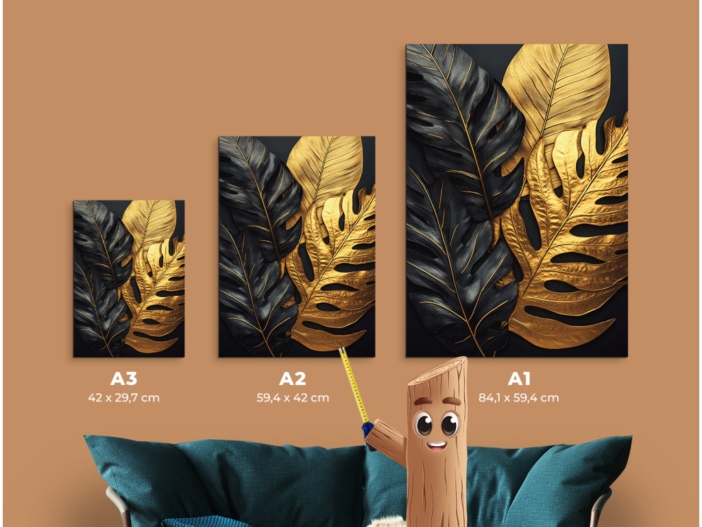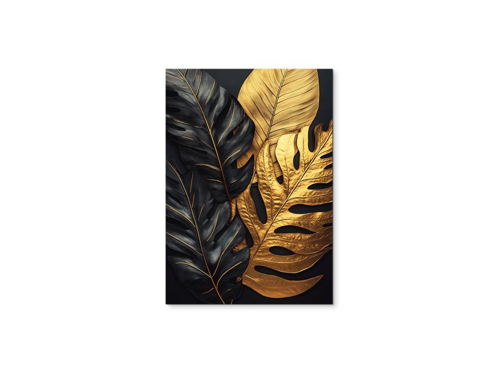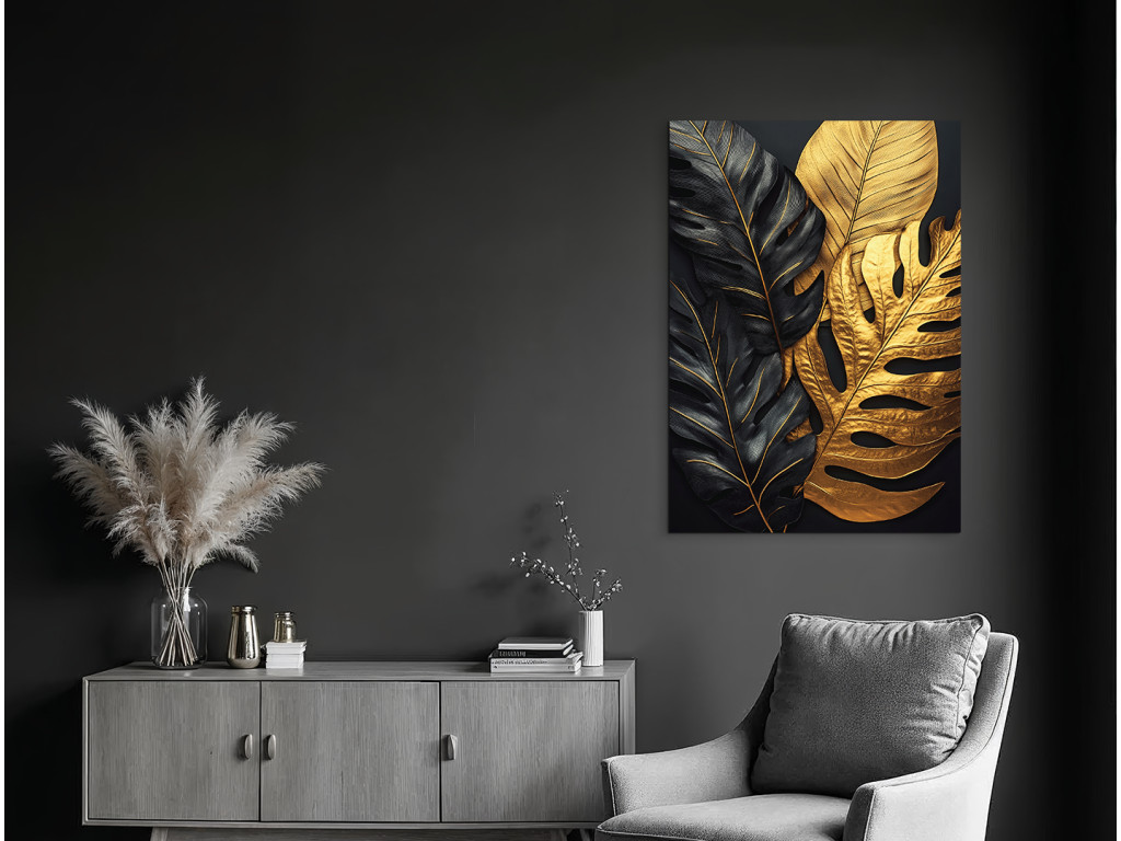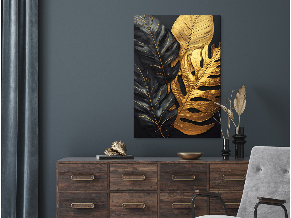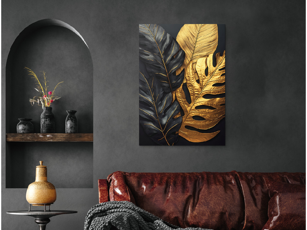 Az Elegáns levelek egy modern kép, amely elegáns sötét háttér előtt fekete és arany levelek kombinációjával tűnik ki. A minimalista, mégis jellegzetes dizájn rendkívül stílusos és kifinomult. Tökéletesen illik egy modern nappaliba, dolgozószobába vagy fém és sötét fa elemekkel díszített enteriőrbe.