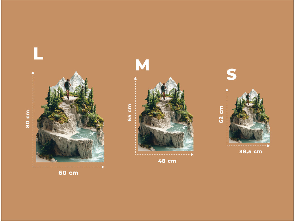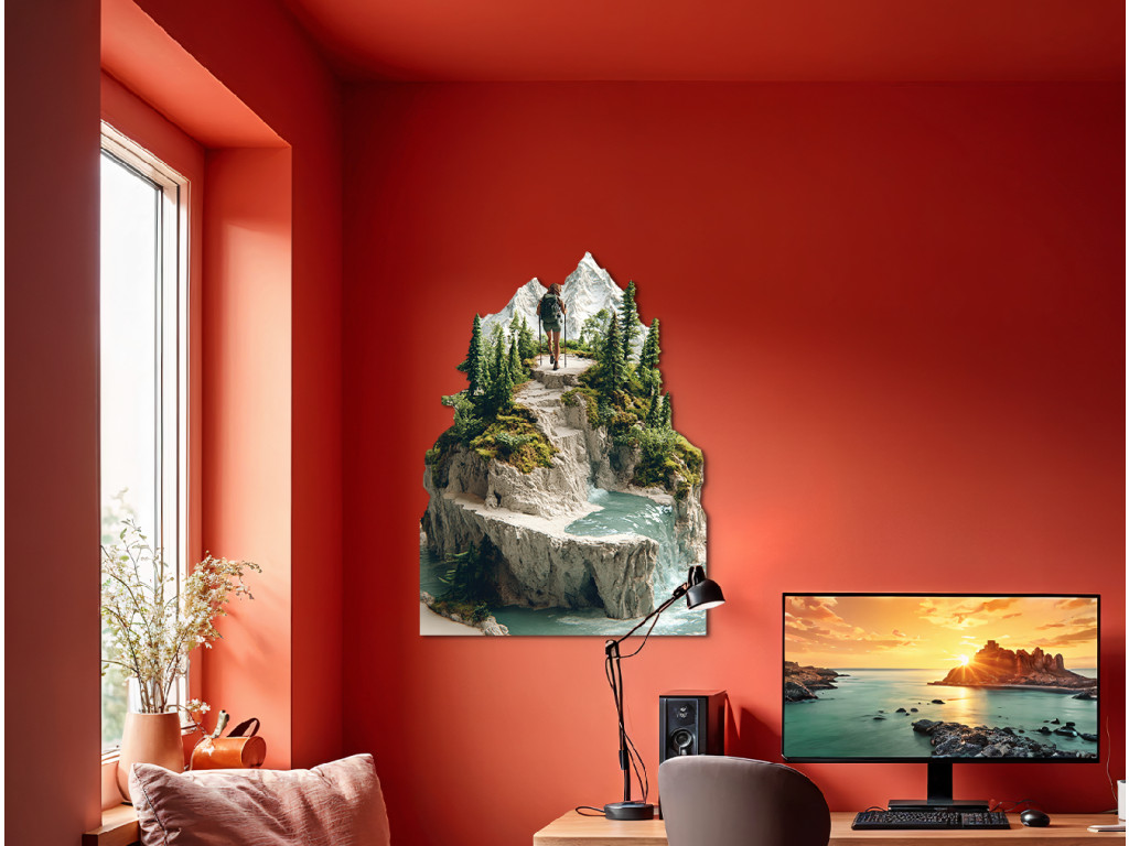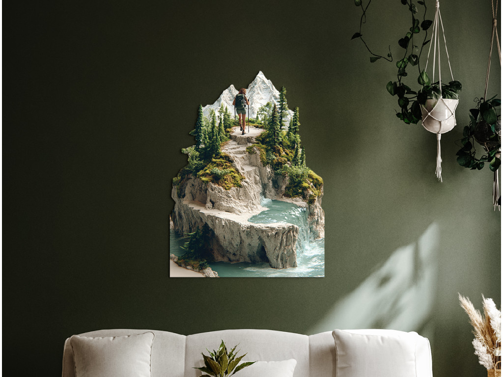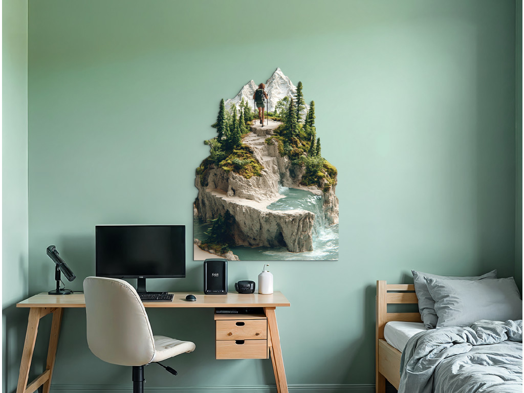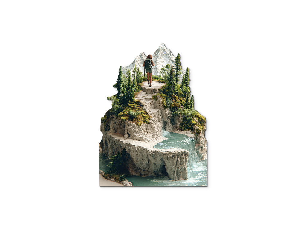 A kép egy hátizsákkal és botokkal a kezében túrázót ábrázol, aki egy hegyi ösvényen sétál egy havas csúcs felé. A környező táj gazdag zöld növényzetben, tűlevelű fákban és sziklás terepen. A háttérben egy vízesés folyik le egy sziklás sziklafalon egy türkizkék tóba vagy patakba, harmonikus természeti tájat teremtve a magassági rétegek dinamikájával.