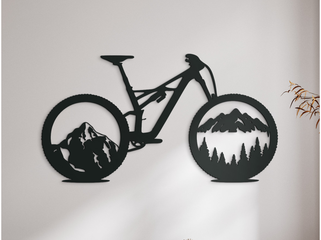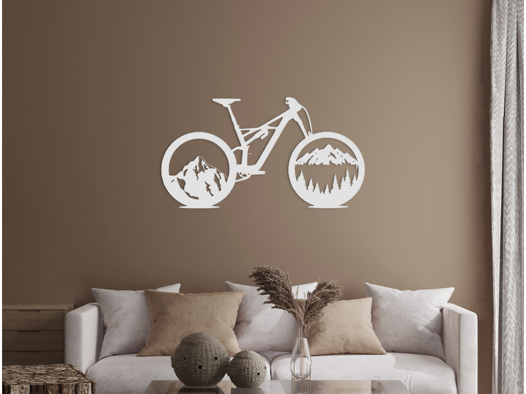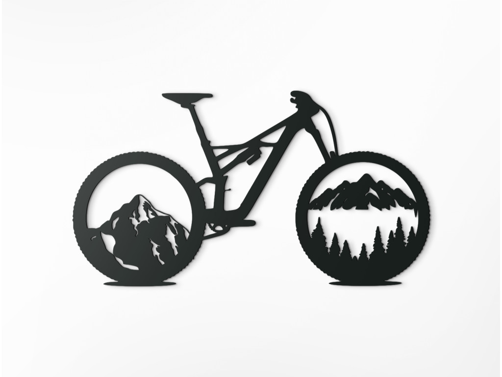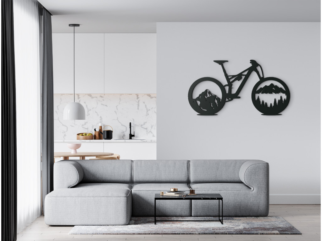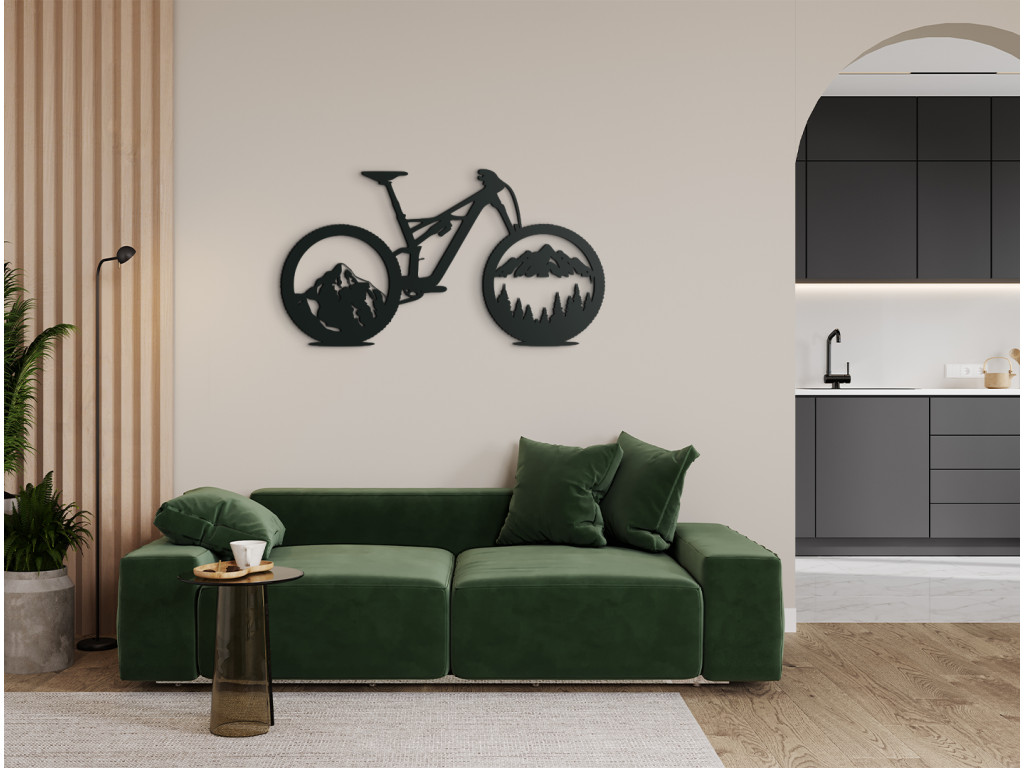 A kerékpározás szerelmesei számára egy különleges arculatú képpel készültünk, amely biztosan megsimogatja majd a lelküket. A hegyi kerékpár minden szempontból dizájn kellék. Kerekeiben magas hegyek és erdő található. Különösen alkalmas modern belső terekbe.