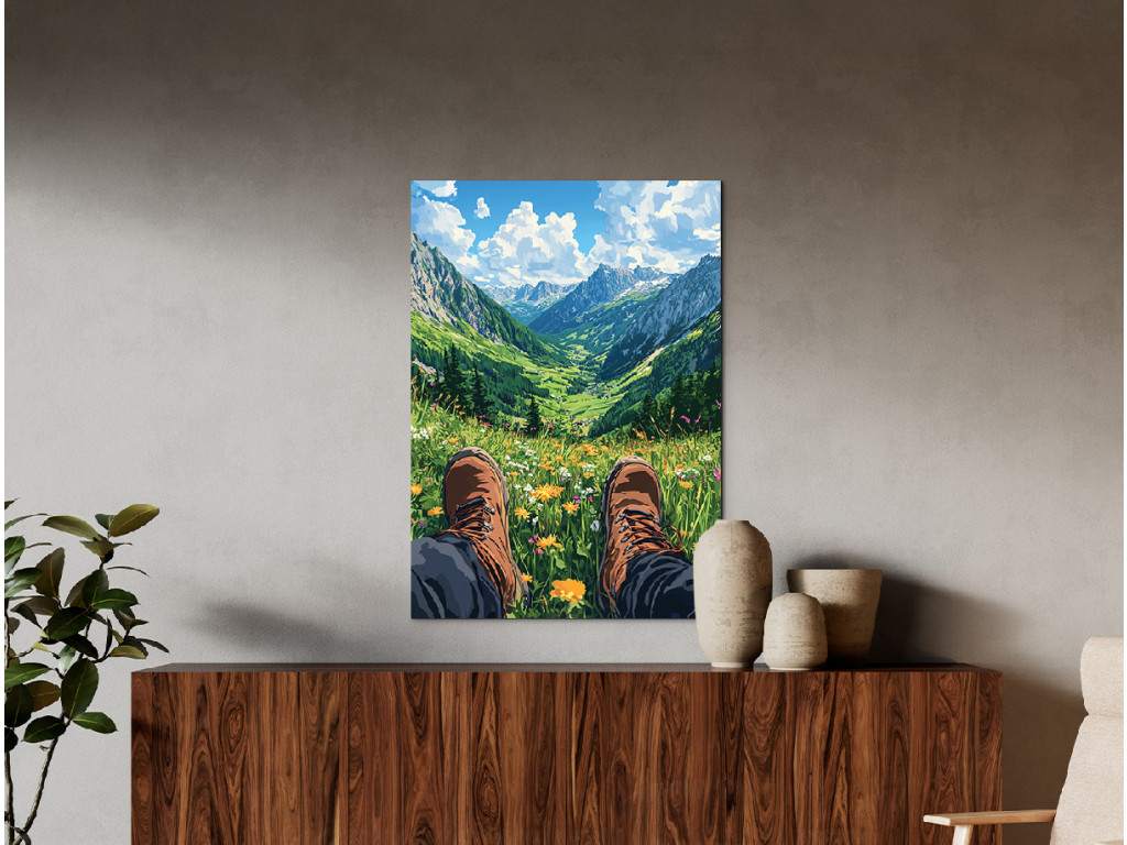 A kép egy ember tekintetét ragadja meg - túrabakancsos lábak pihennek egy virágos réten. A nézőt egy hatalmas, fényben fürdő hegyi völgy látványa fogadja. A kompozíció a béke, a szabadság és a természettel való kapcsolat érzését kelti.