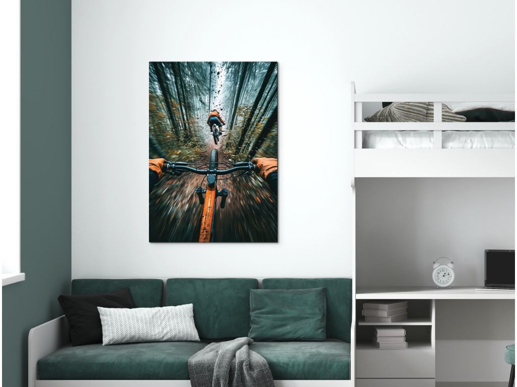 Egy modern kép, amely egy erdei ösvényen tekerő hegyi kerékpárost ábrázol, előtte egy másik kerékpárossal, mozgás és kaland érzetét keltve.