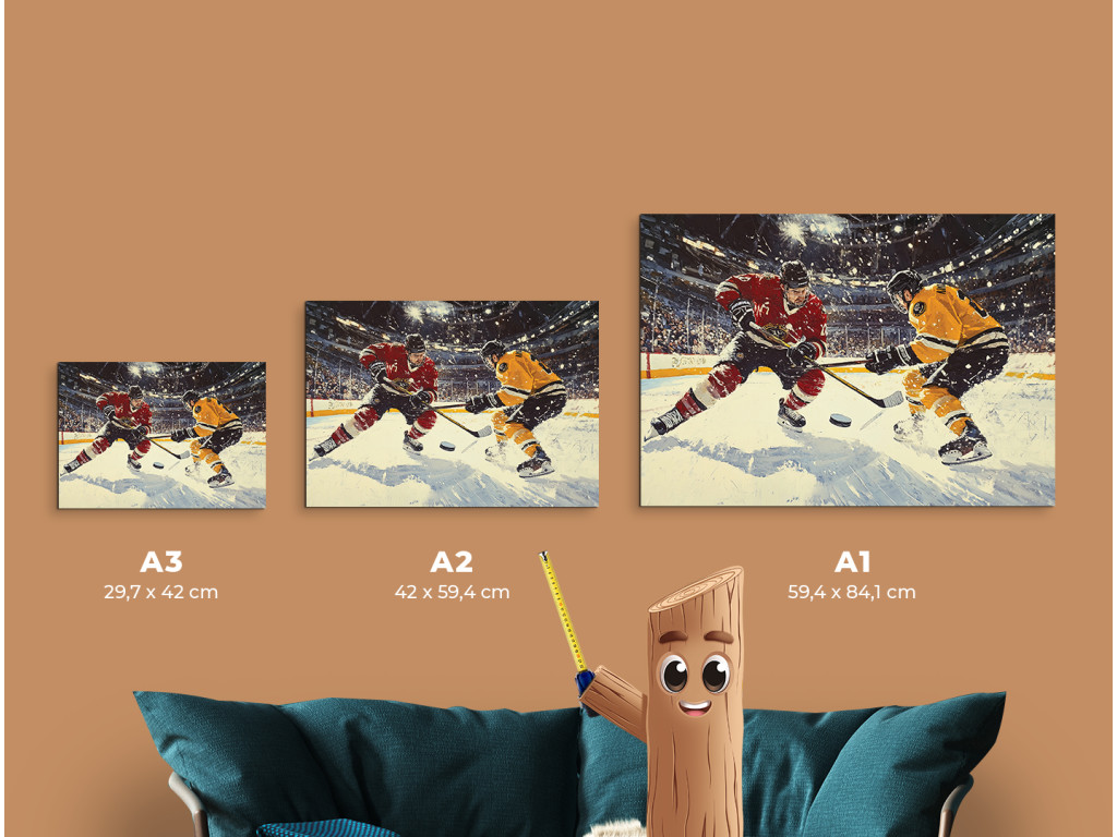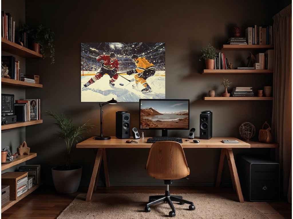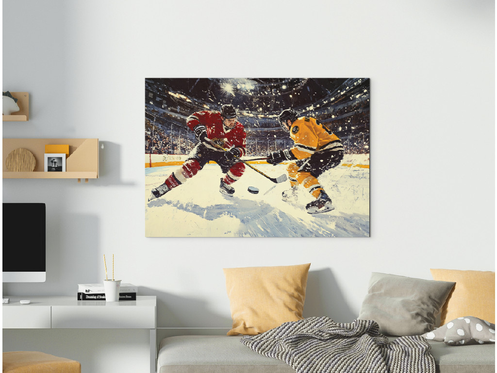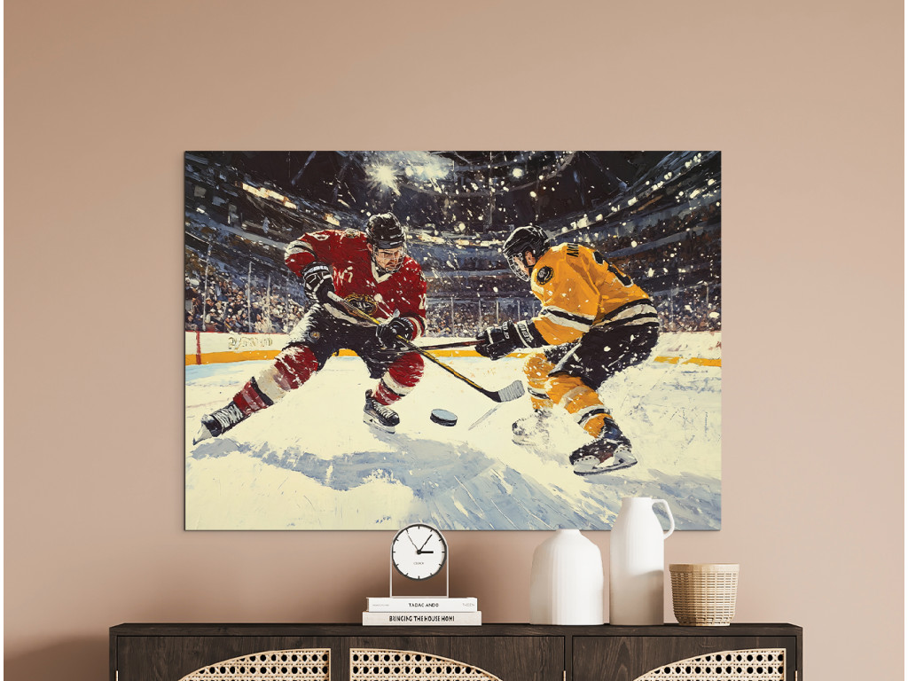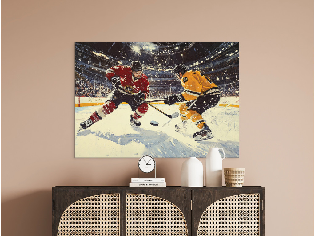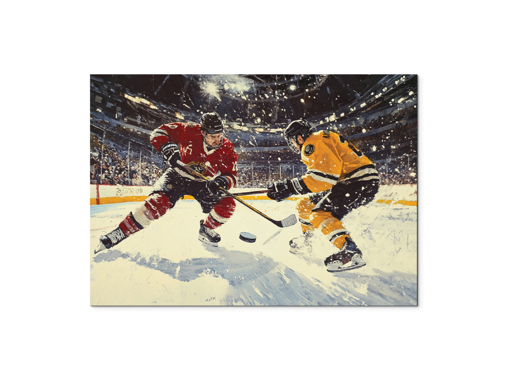 A kép egy hokimeccs drámai pillanatát ábrázolja, ahol két játékos – az egyik pirosban, a másik sárga-feketében – küzd a korongért. A dinamikus mozgást kiemeli a korcsolyák alól kihulló hó, míg a háttér az arénával és a fényekkel energiát és feszültséget ad a jelenetnek.