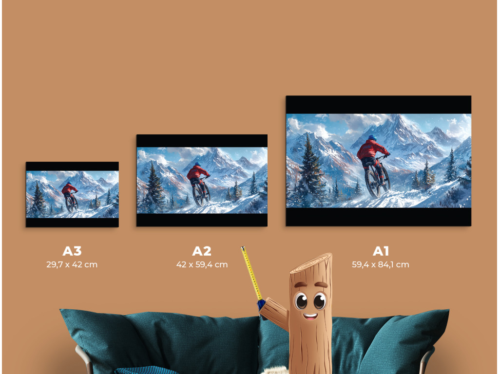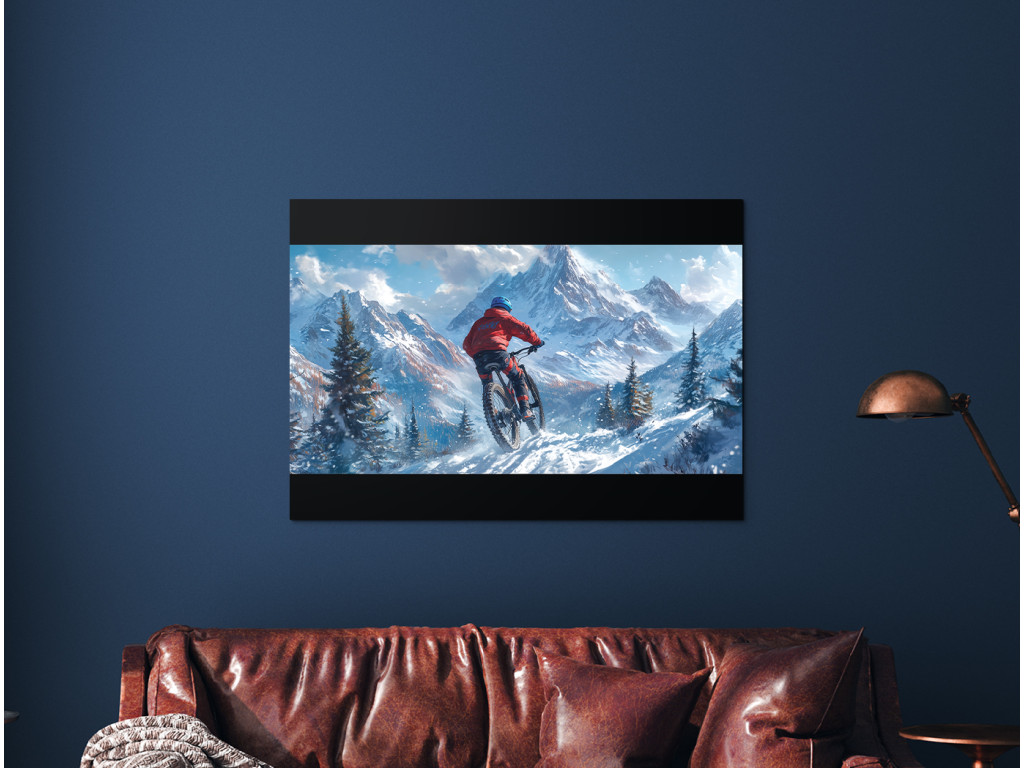 A kép egy dinamikus hegyikerékpáros jelenetet örökít meg, ahol egy speciális hegyikerékpáron kerékpározó durva, természetes terepen küzdi le magát. A jelenet a szabadságot, a fizikai kihívást és a természettel való kapcsolatot idézi fel.