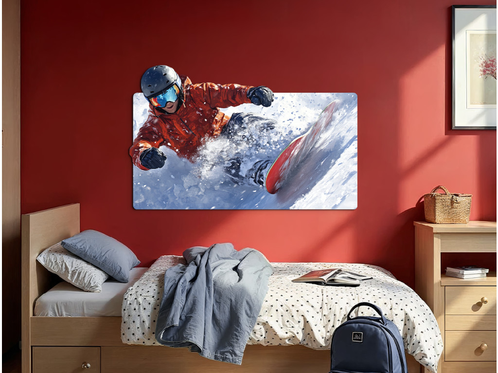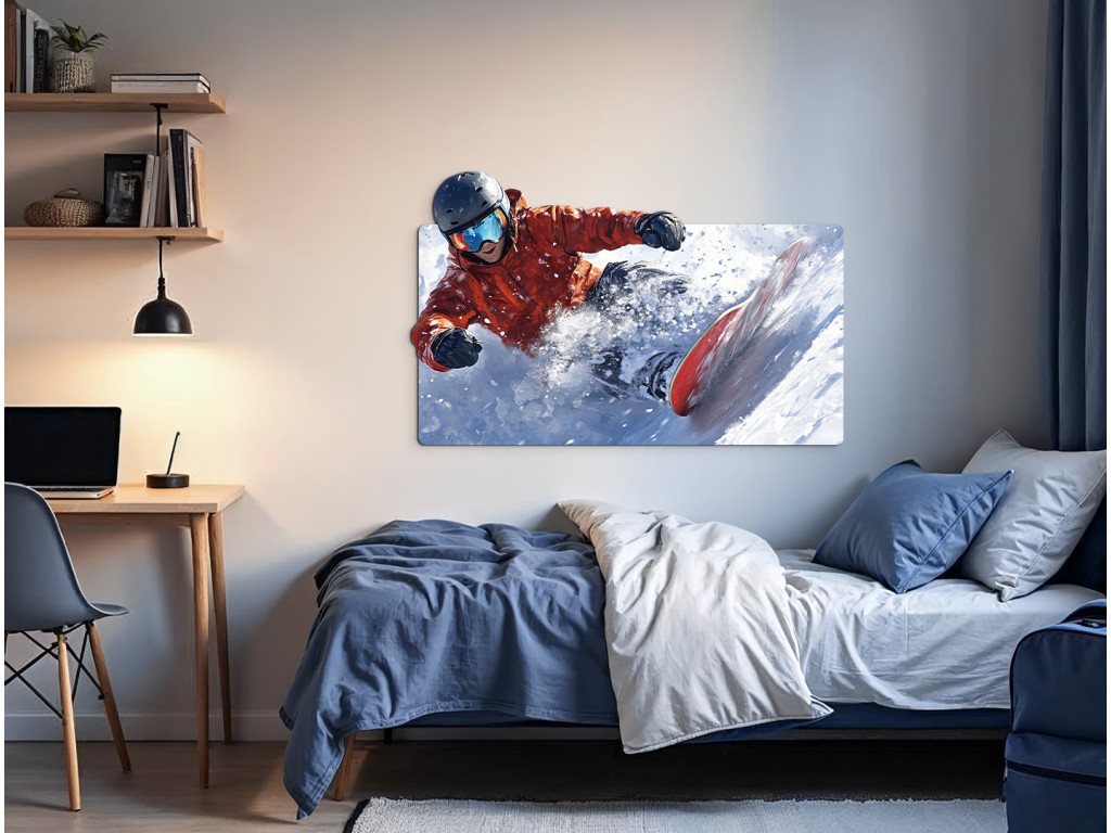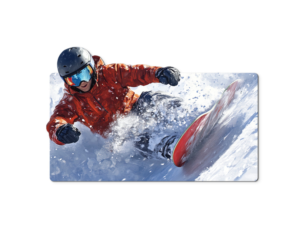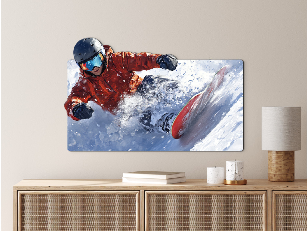 A kép egy snowboardost ábrázol dinamikus pózban ugrás vagy snowboardozás közben, porhóval körülvéve. A fehér havas terep és a mozgó ösvény a sebesség, a szabadság és az energia benyomását kelti.