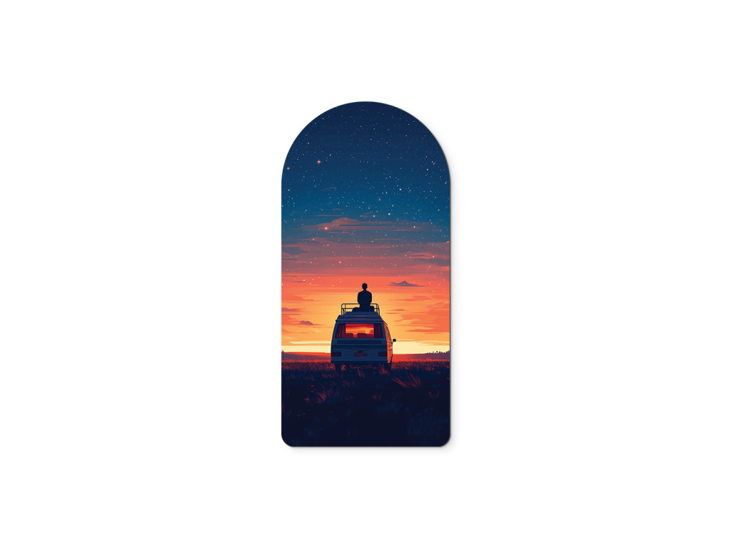A Csillagok alatt kép finom hangulatú dekoráció, amely kellemes érzetet kelt: egy személy a furgon tetején ülve figyeli a naplementét a csillagos ég alatt, ami a nyugalom és a természethez való kapcsolódás élményét hozza el, miközben meghitt békét és szelíd szabadságot sugall.