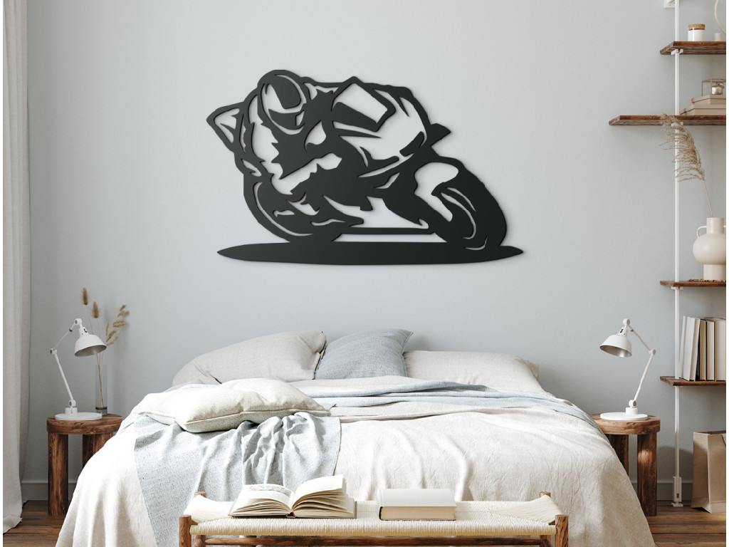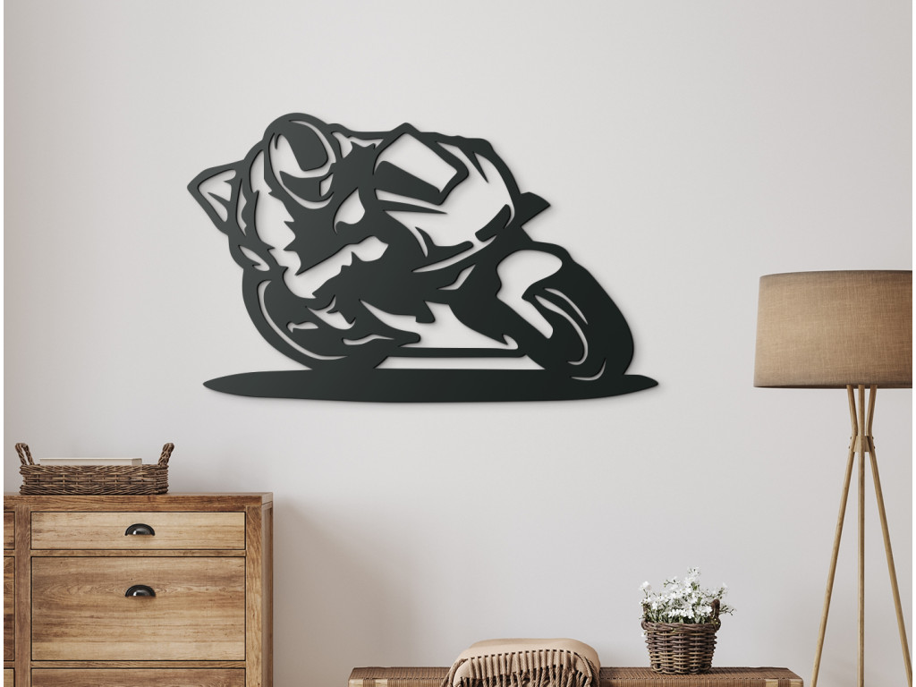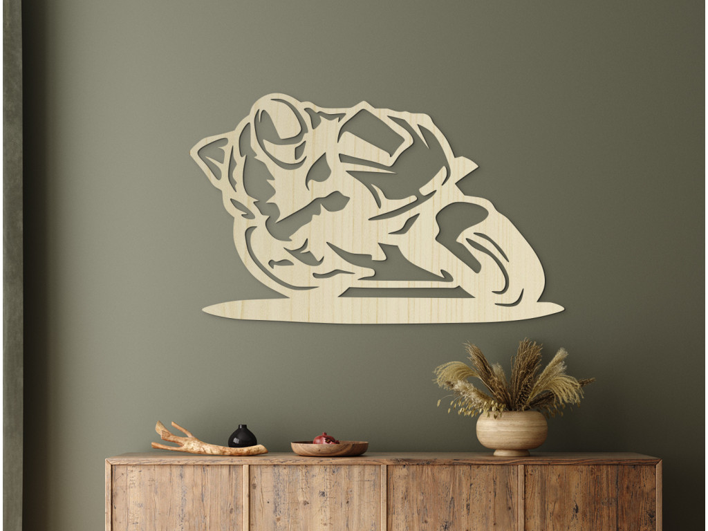 Kölcsönözzön egy adag adrenalint belső terének ezzel a fából készült falmatricával, amely megörökít egy motorost egy kanyarban. Csodálatos ajándék minden motorkerékpár szerelmesnek.