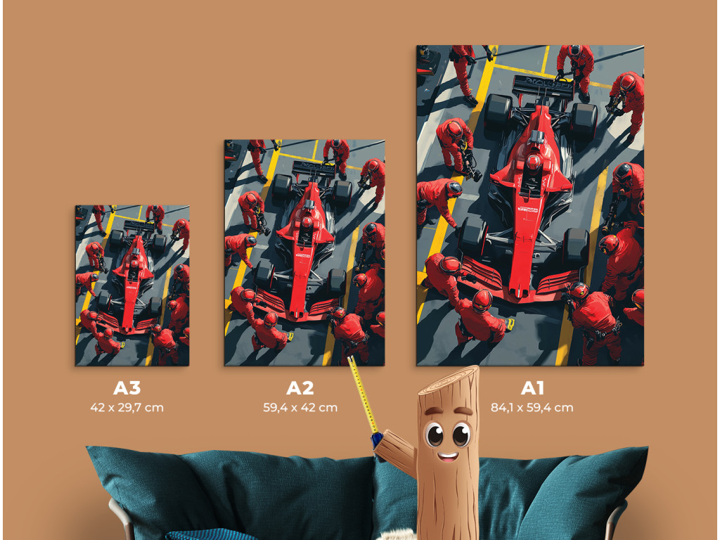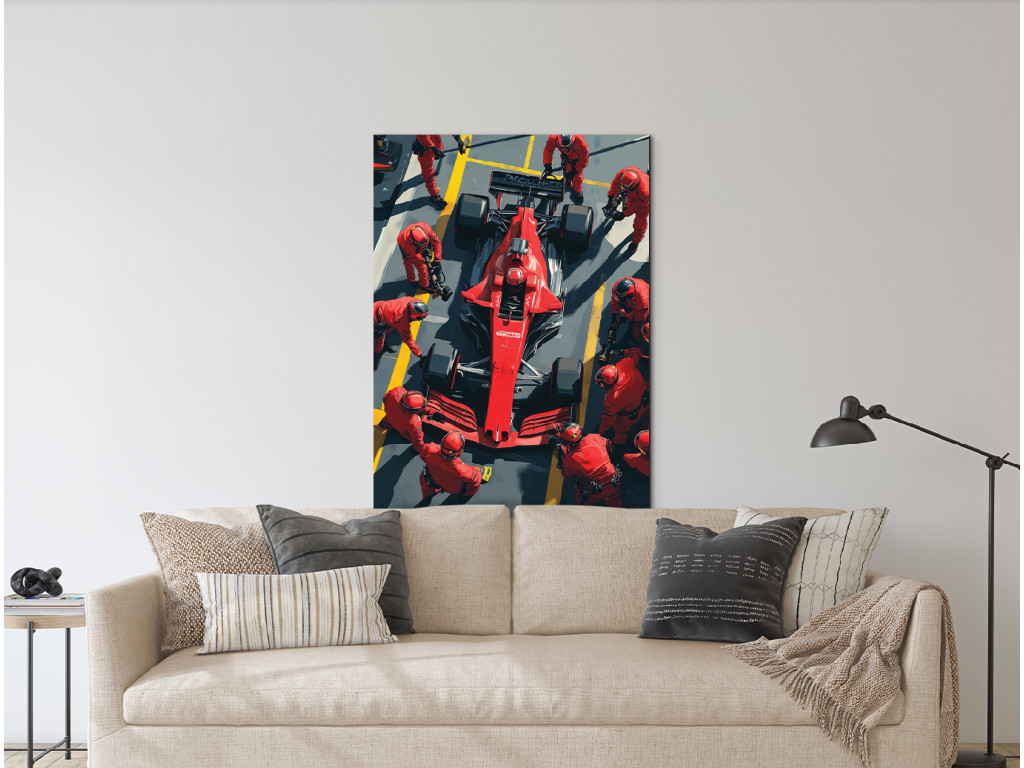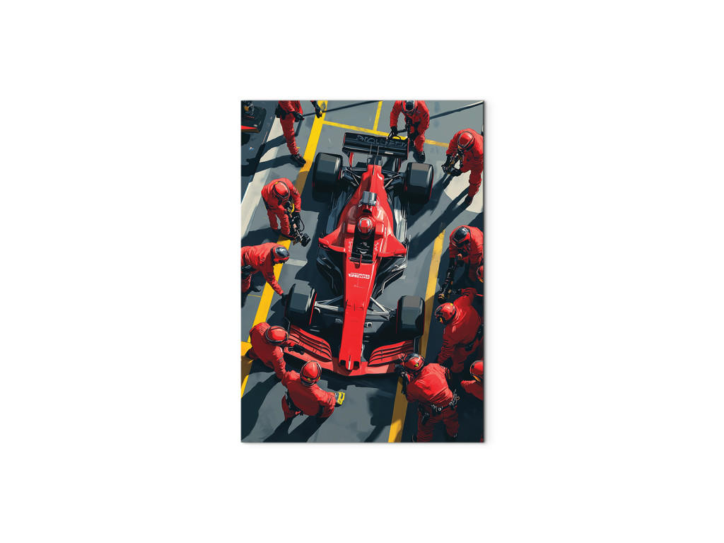 A lenyűgöző kép egy Formula–1-es boxkiállás során végzett gumicsere drámai pillanatát örökíti meg. A dinamikus kompozíció kifejezi az F1 világát meghatározó sebességet, precizitást és csapatmunkát.