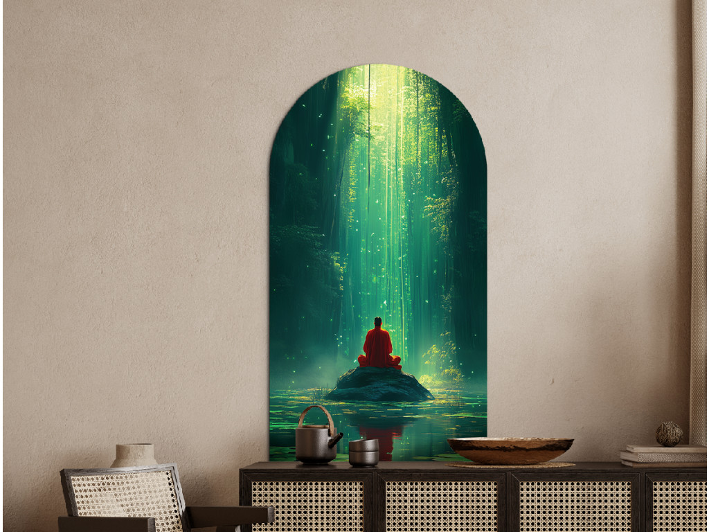 Ez az érdekes festmény egy vörös ruhás alakot ábrázol, aki meditatív pózban ül egy sziklán egy tó közepén, sűrű erdő és átható fény veszi körül. A jelenet békésnek és spirituálisnak tűnik, egy csipetnyi misztikummal.