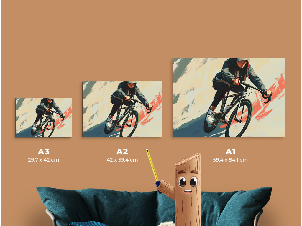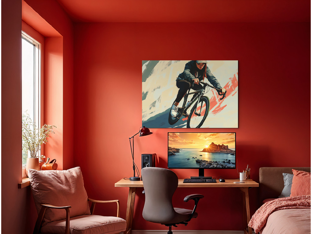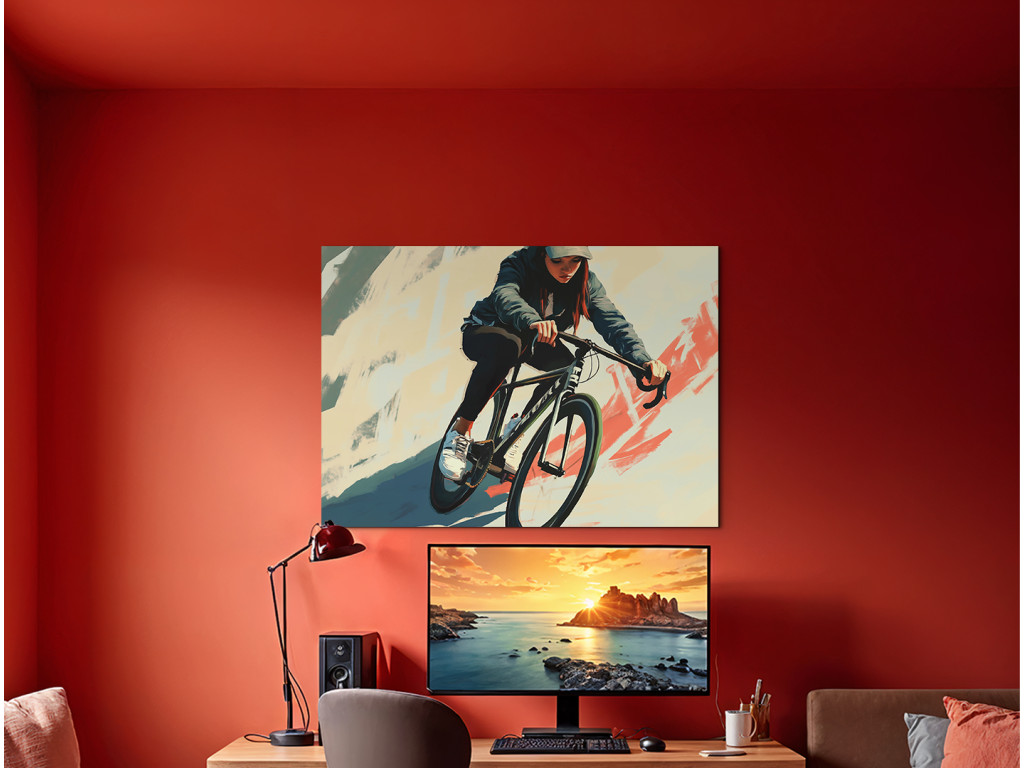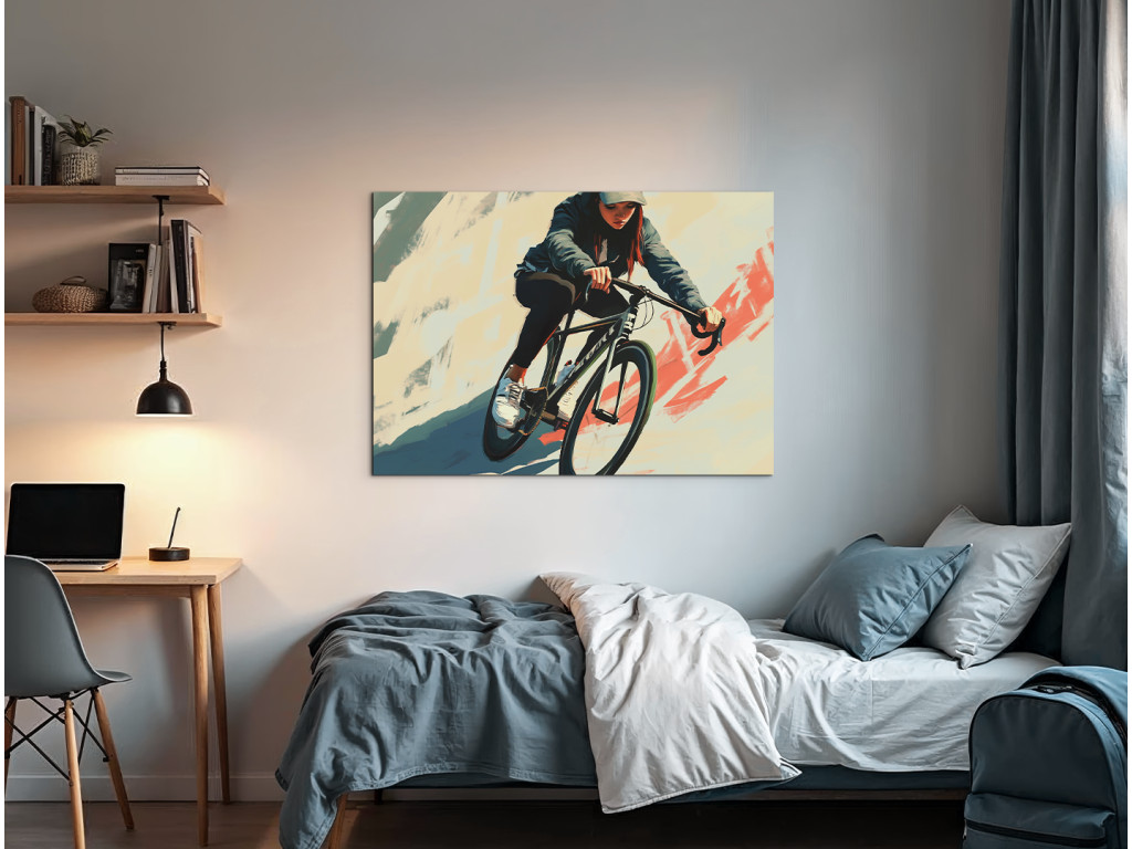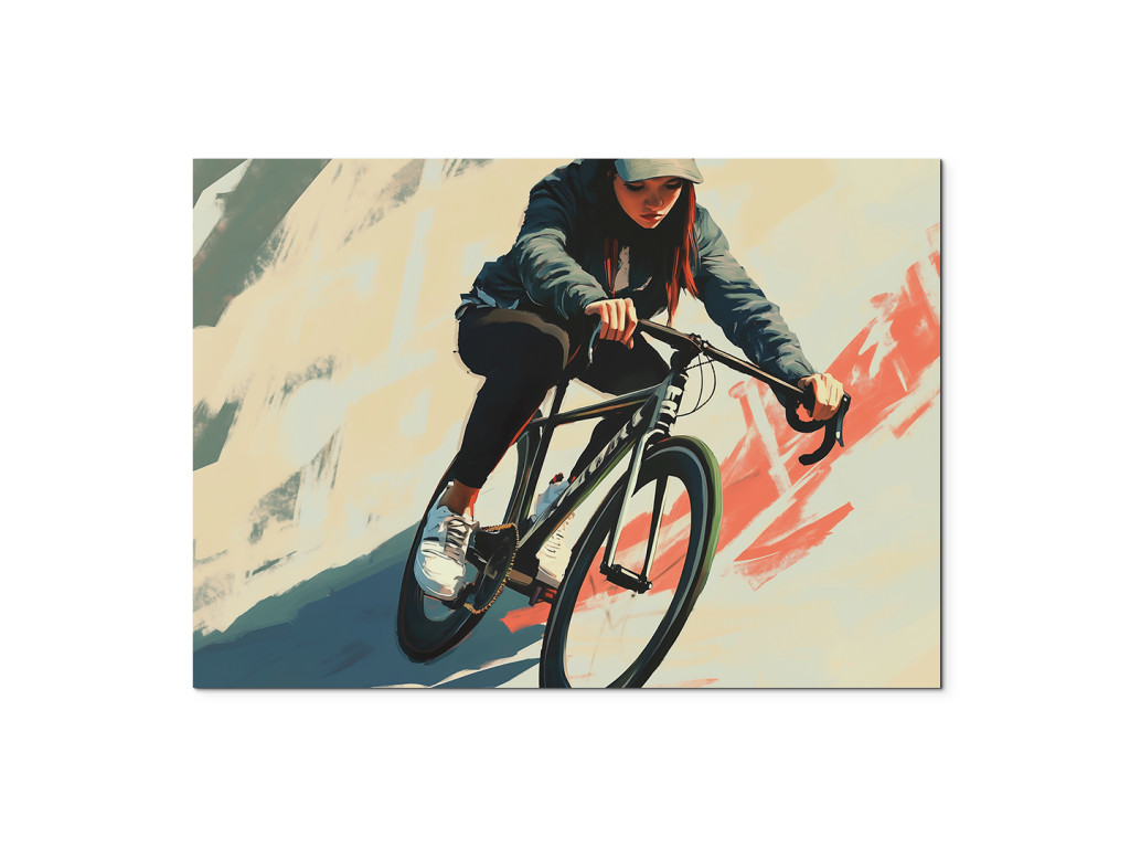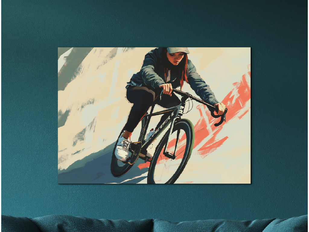 A Nő biciklin kép egy kerékpározó nőt ábrázol, amely a szabadság, a béke, a nyári gondtalanság vagy a természettel való összhang érzetét kelti. A mű stílusától függően (retró, minimalista, színes vagy pasztell) a hatás lehet romantikus vagy nosztalgikus, de akár modern és letisztult is.