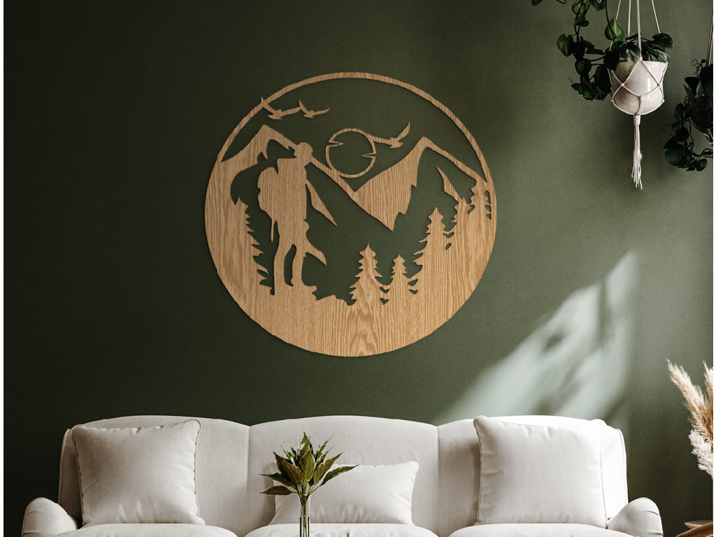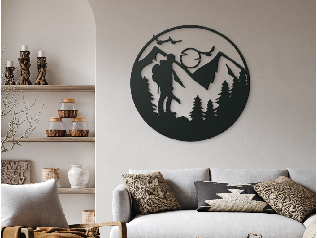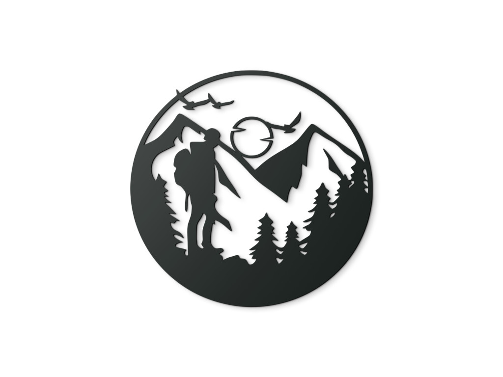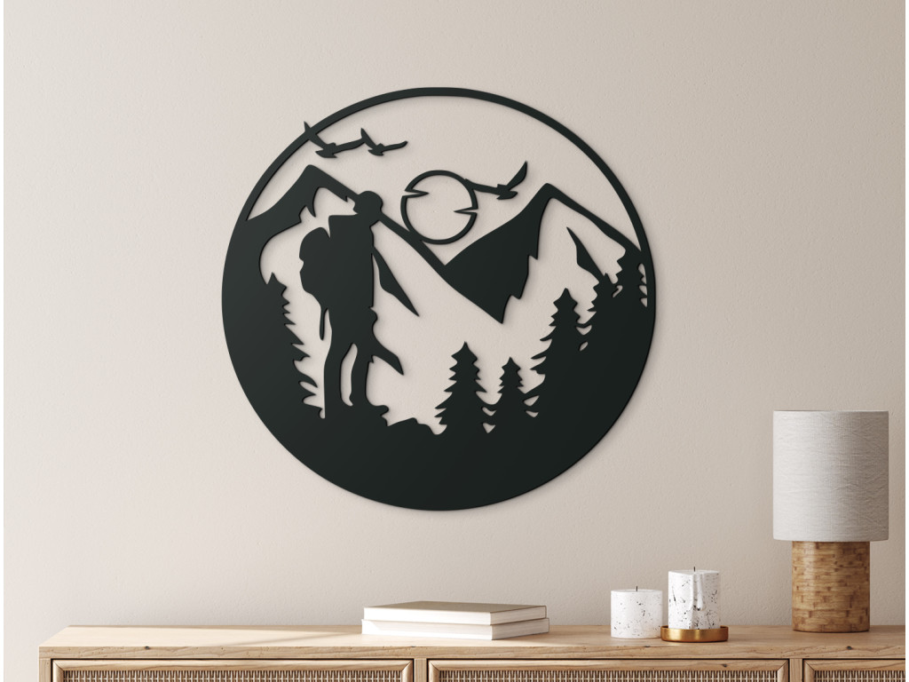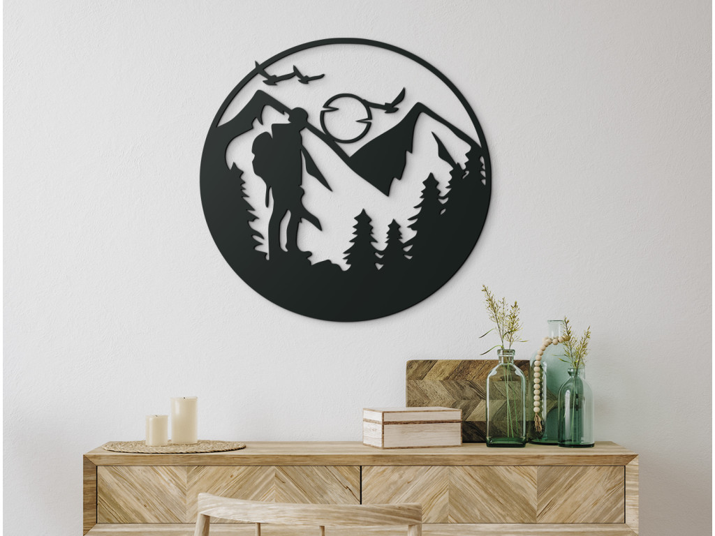 A dekoráció egy túrázó figurát örökít meg, aki örömmel élvezi a hegyek és a természet panorámáját. Meghívás, hogy nézzen körül ön is a vadonban, és fedezzük fel a minket körülvevő szépséget.