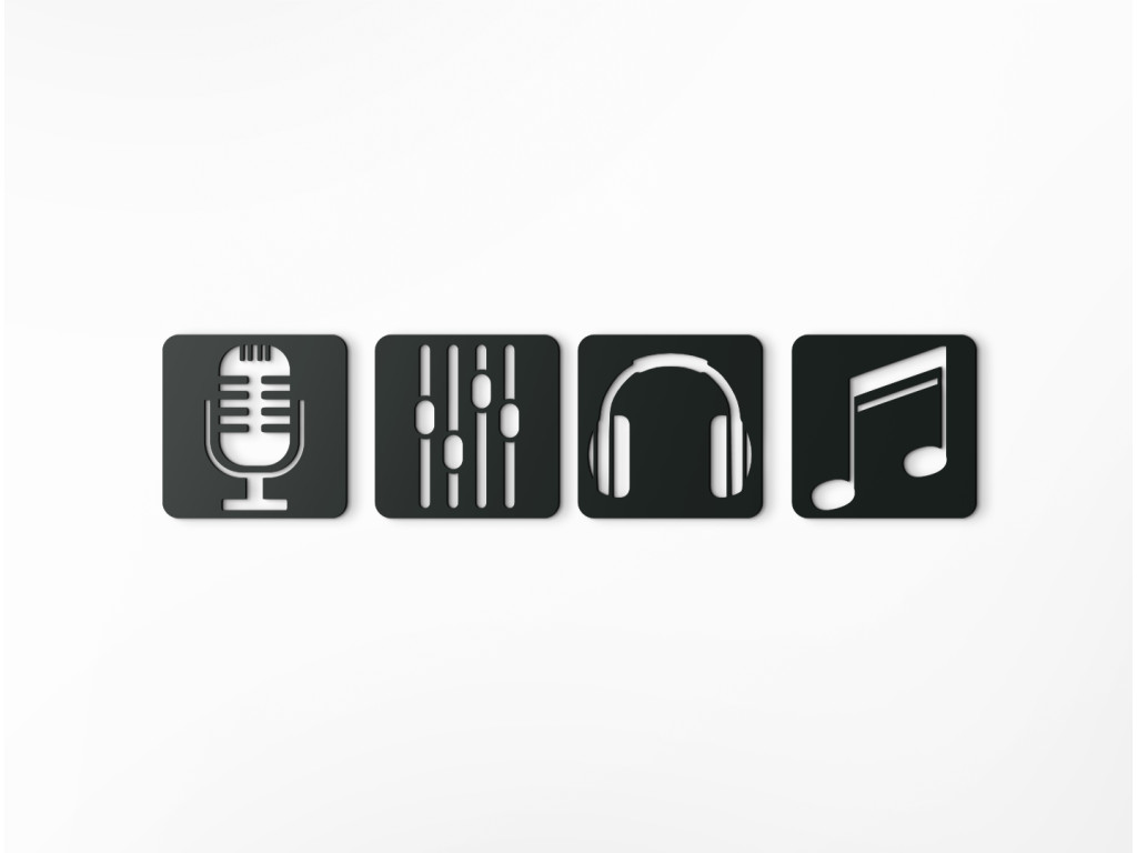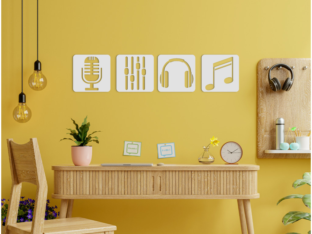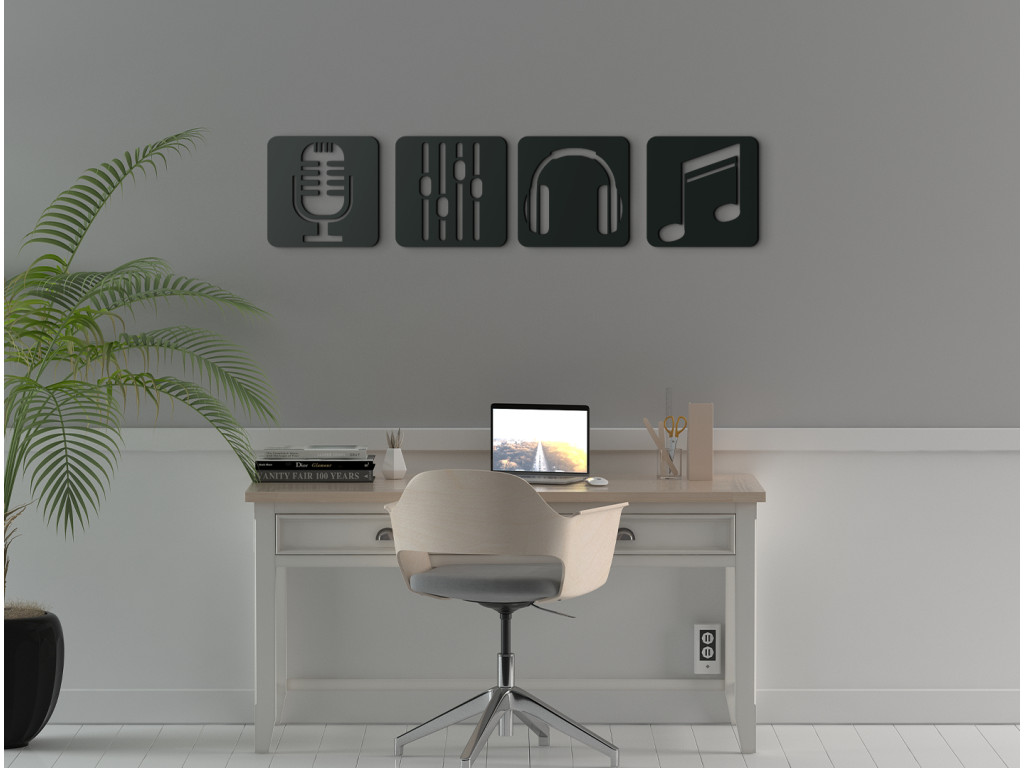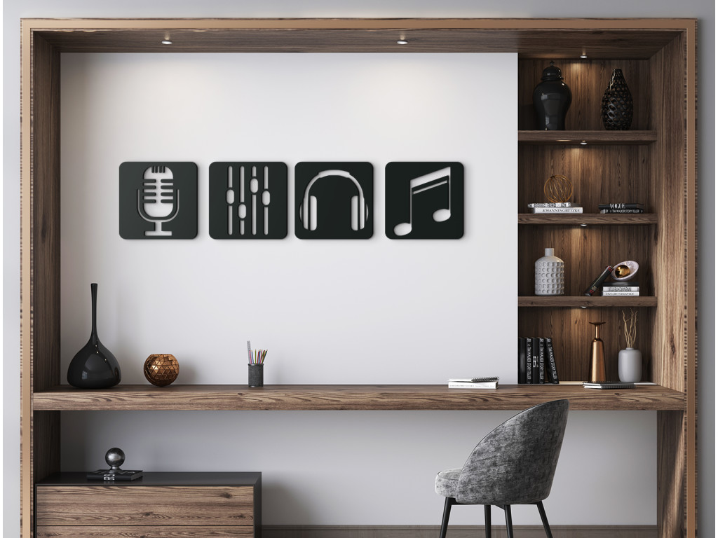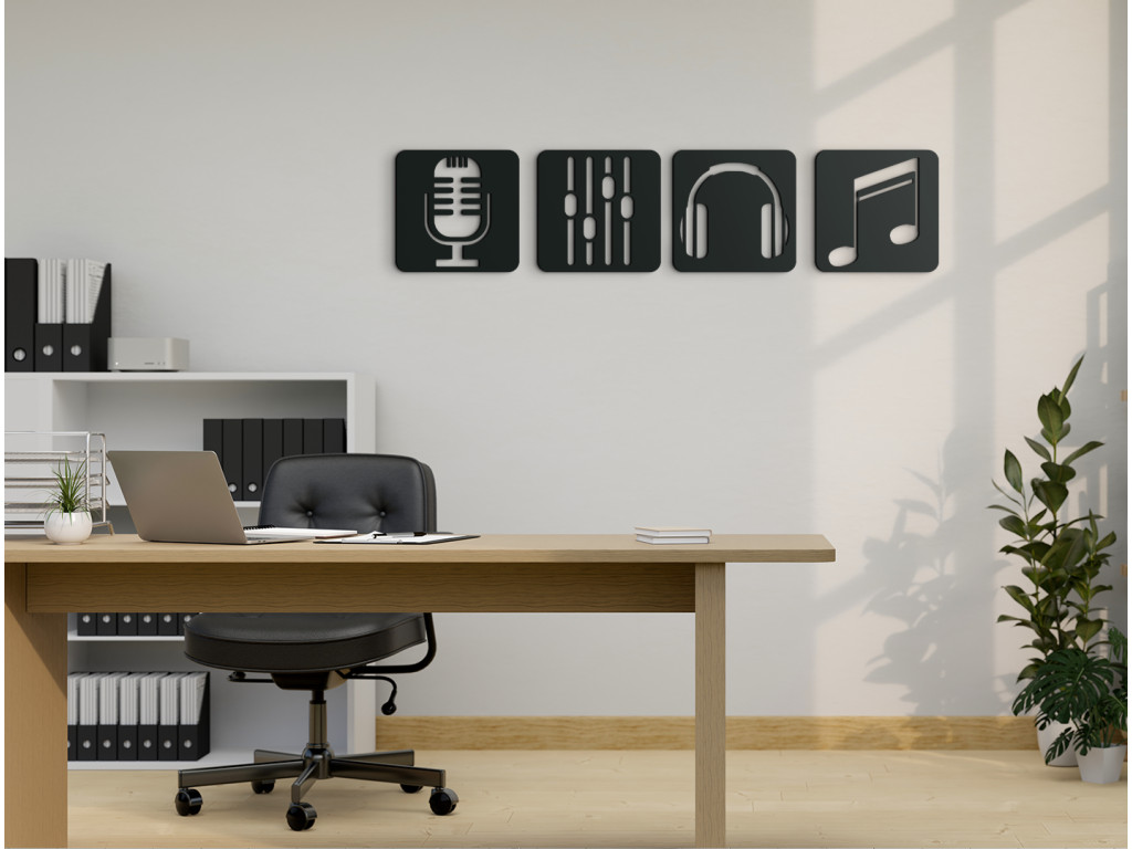 A zene összeköt, teremt, örömet okoz. A 4 részes kép a hangstúdió szimbólumaival eredeti dizájnt visz minden enteriőrbe. Az első képen egy mikrofon látható, a második képen egy keverő, a harmadikon a fejhallgató, az utolsón pedig egy hangjegy található. Egy ilyen eredeti kialakítás sok stílushoz illeszkedik.