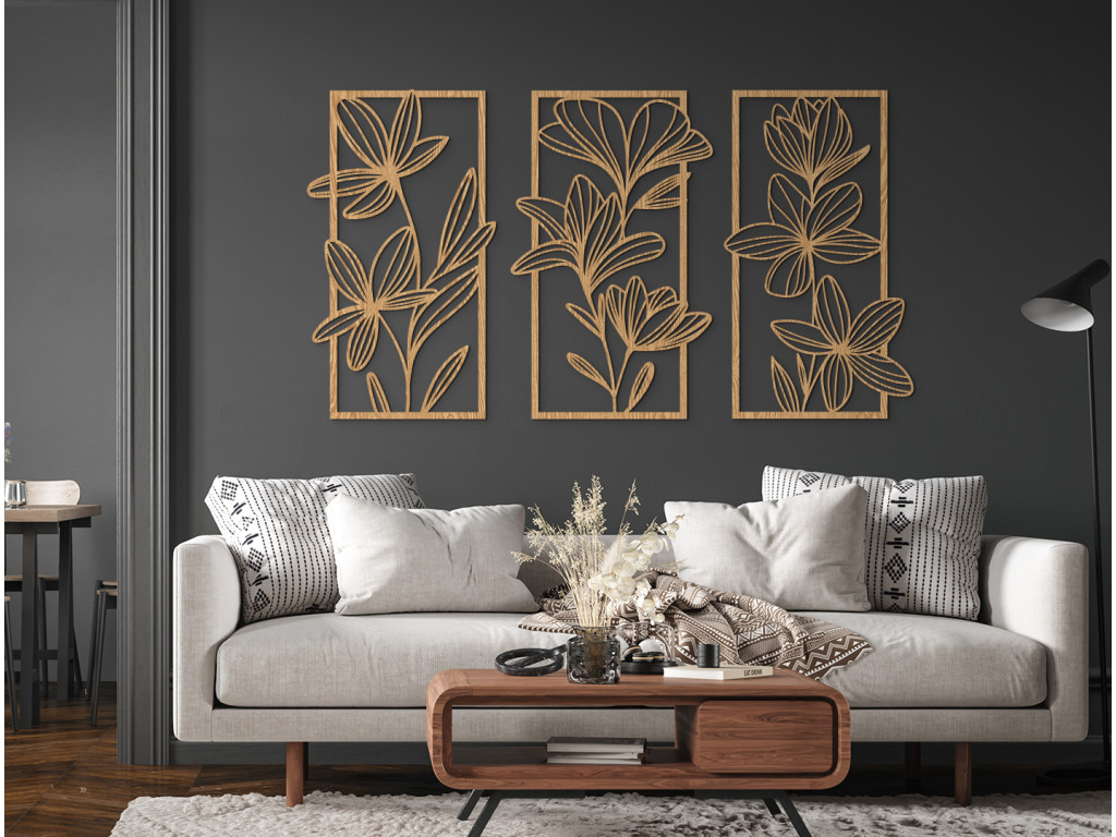 A három darabból álló, fából készült Nagy virágok című kép gyönyörű, természeti motívumot visz otthonába, tele élettel és eleganciával. A precízen faragott virágok minden egyes panelen harmonikus és szemet gyönyörködtető kompozíciót alkotnak. Nagyszerű dísze lehet nappalijának, dolgozószobájának vagy hálószobájának, amely egy csipetnyi bájt és természetes bájt kölcsönöz a térnek.