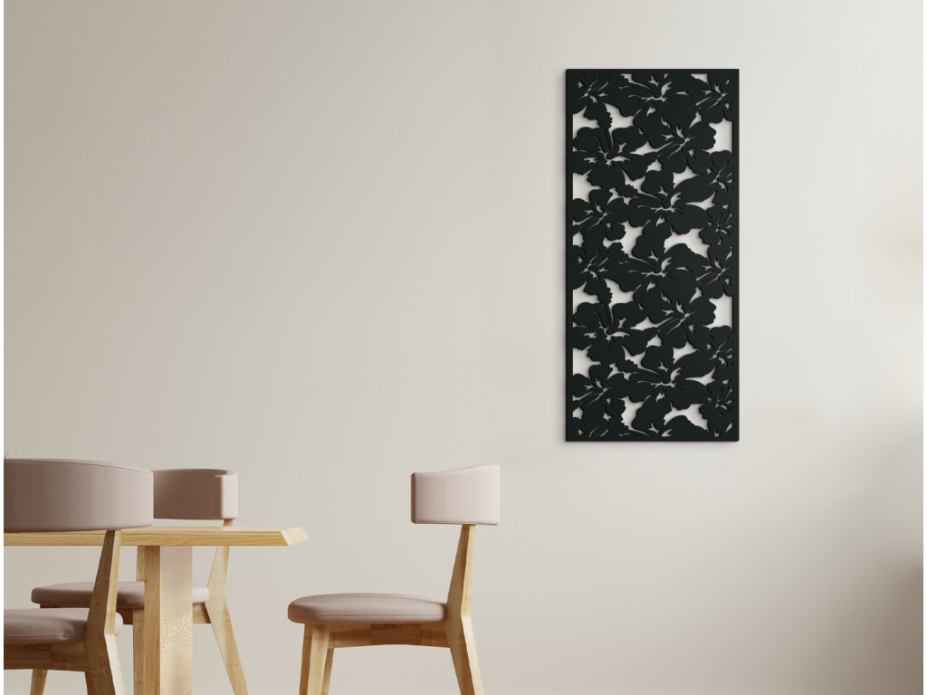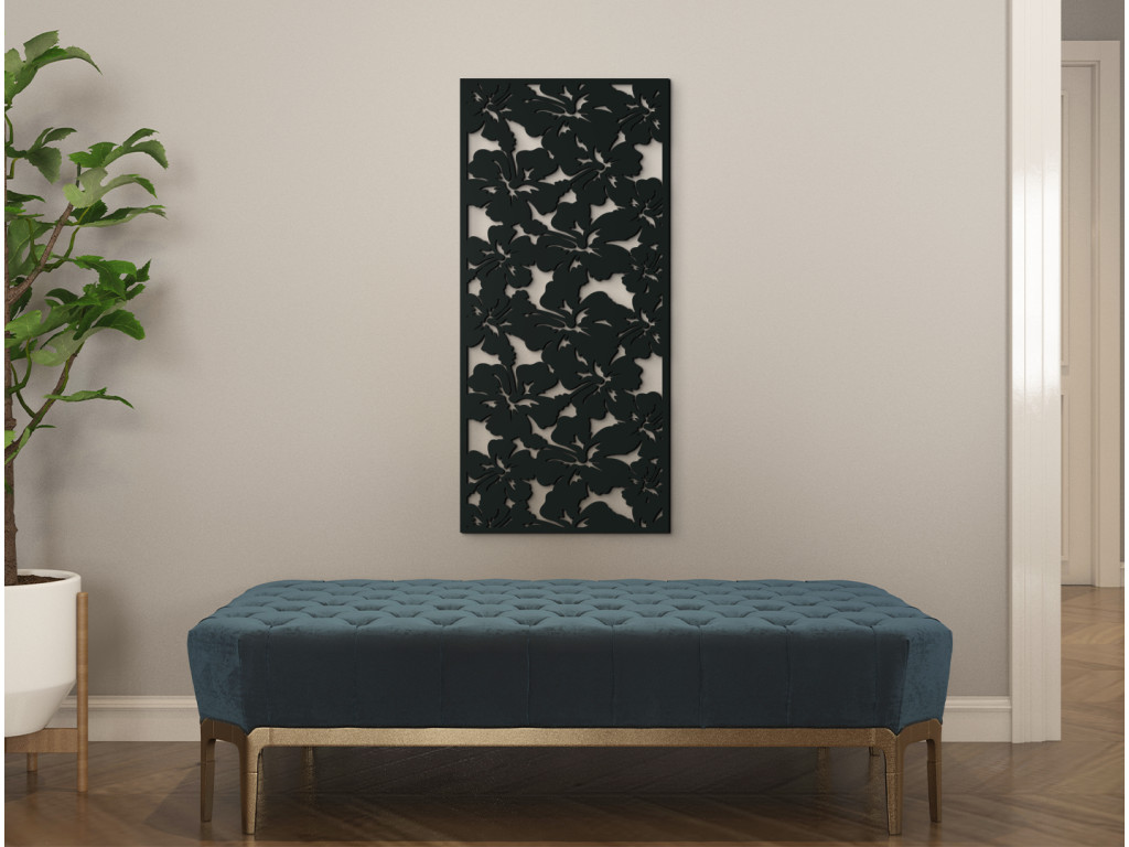 A hibiszkusz egy olyan virág, amelyet a trópusi virágok királynőjének tartanak, és különböző színekben létezik. Ahogyan a valóságban is nagy színes szirmairól ismert, úgy egy fatáblán is így van ábrázolva. A faragott képet az egész felületen ezek a gyönyörű virágok tarkítják. Alkalmas előszobába, folyosóra, hálószobába és egyéb helyiségekbe.
