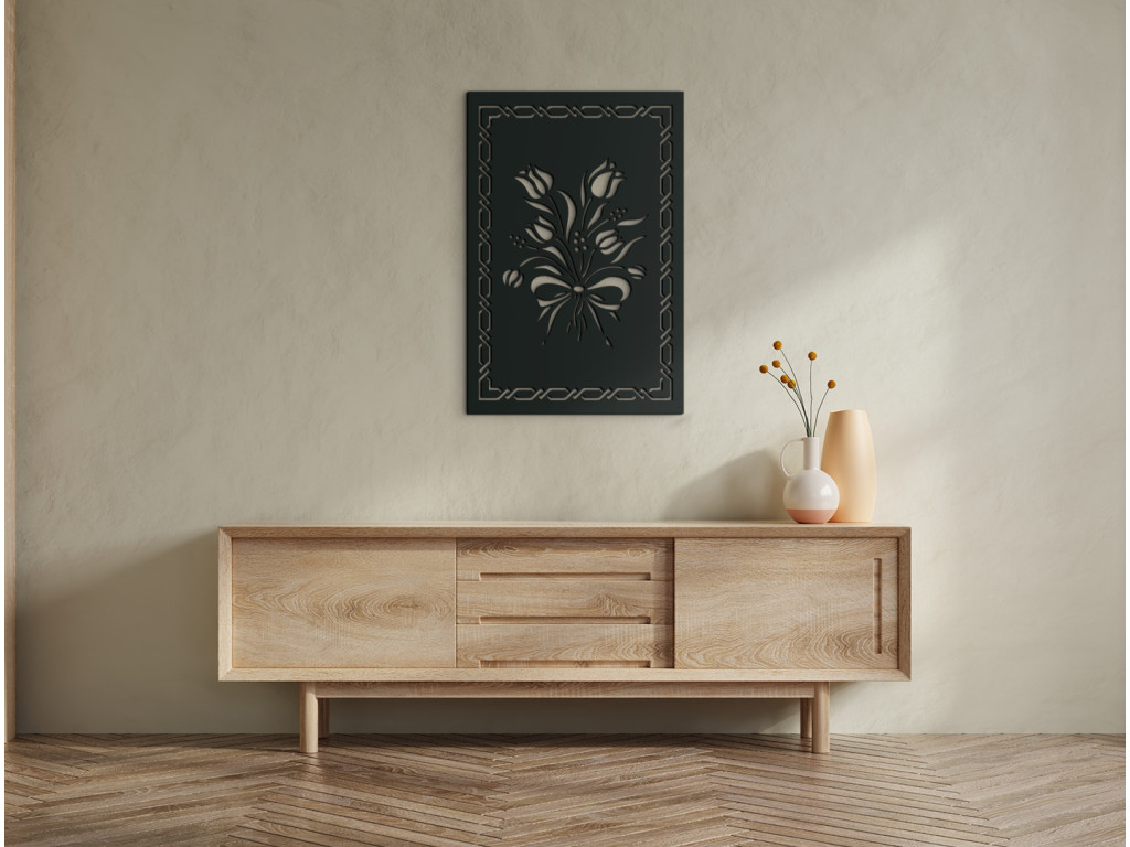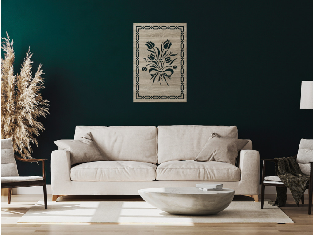 Szereti a hagyományos festményeket? A Virágcsokor fakép ideális klasszikus terekbe. A kép keretét dizájn dekoráció díszíti, közepén virágcsokor látható, köztük a népszerű tulipánok. A festmény remek ajándék lesz virágkedvelőknek, anyukáknak, nagymamáknak.