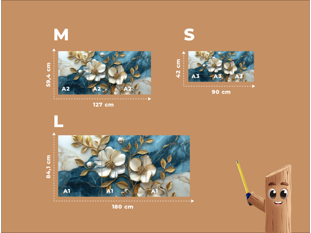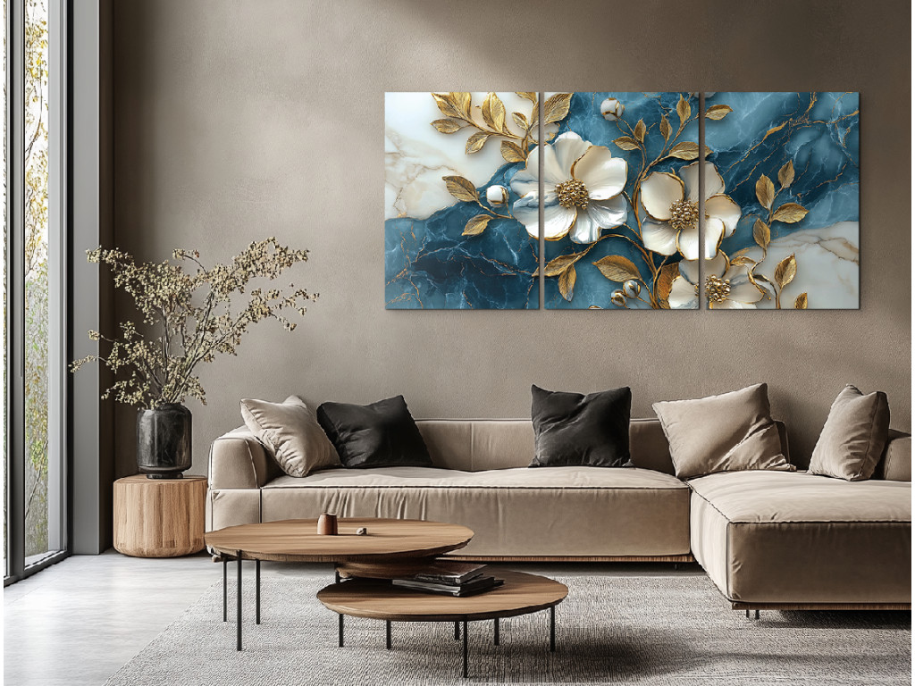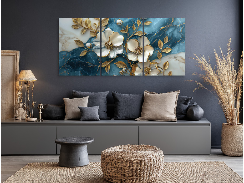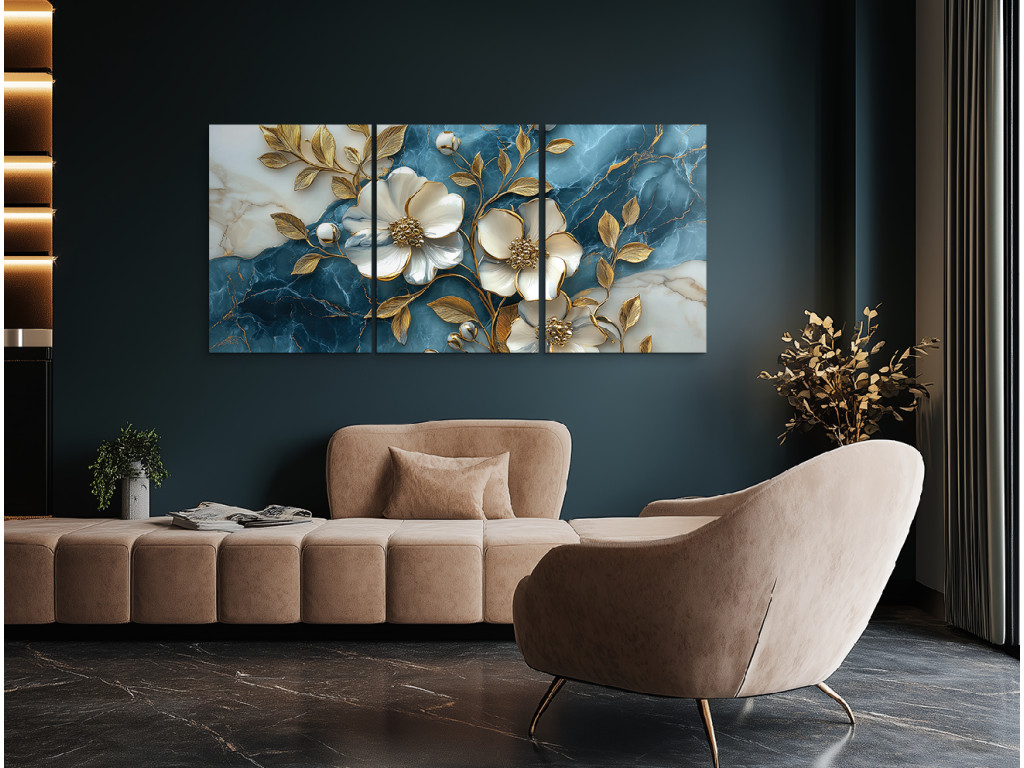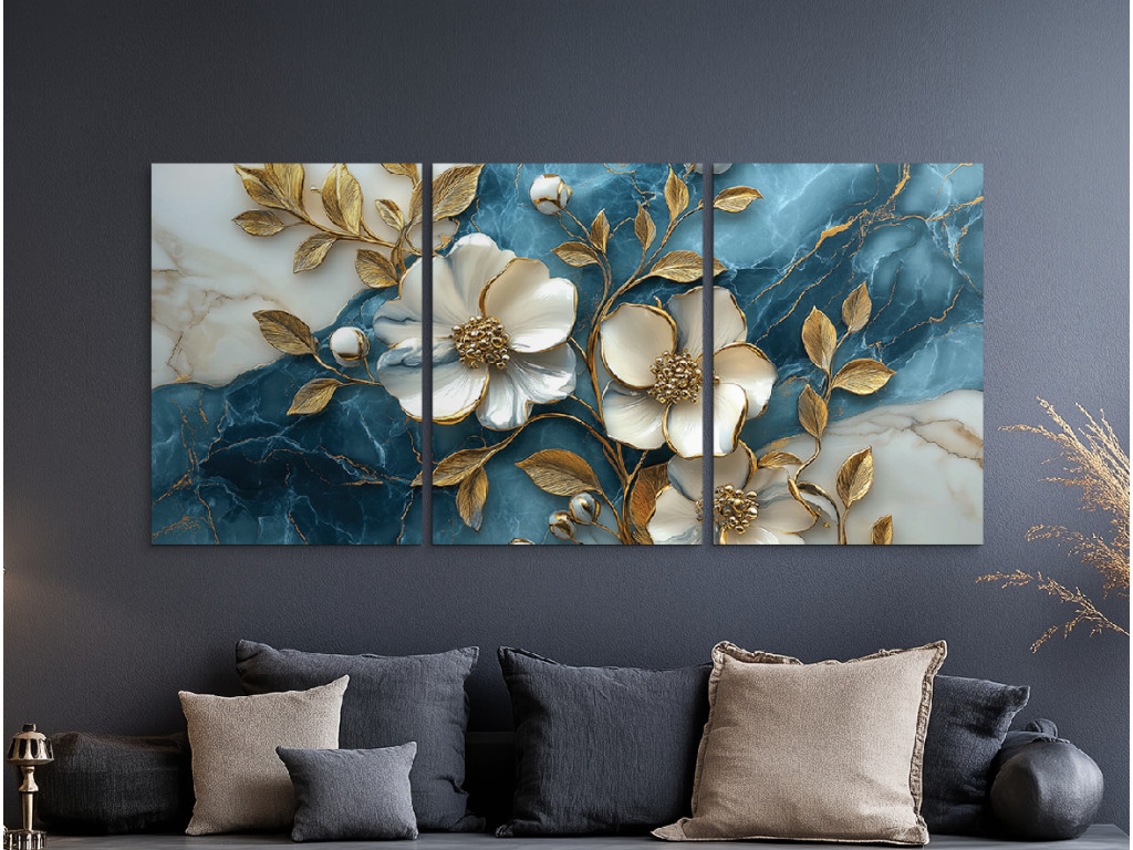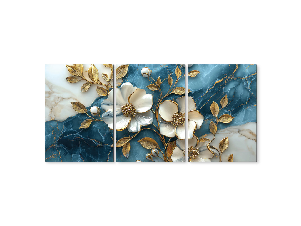 Az Arany virág márványon egy háromrészes fali kép, amely a fehér virágok eleganciáját ötvözi az aranyló levelek finom csillogásával, kék-fehér márványt idéző háttér előtt. A karakteres textúra miatt a virágok plasztikusnak hatnak, finom 3D effektust keltve, ami első pillantásra megragadja a figyelmet.