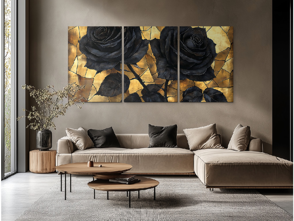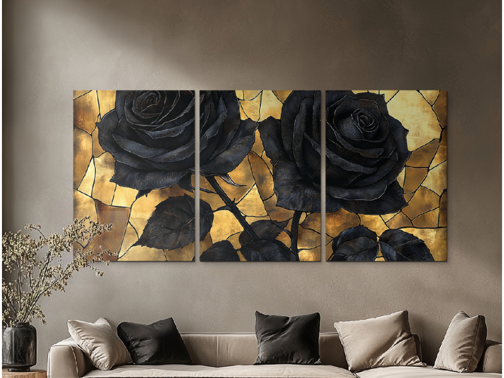 A Fekete rózsák mozaikja egy háromrészes kép, amely két fekete rózsát ábrázol arany mozaikra emlékeztető, törött váza fényes cserepeit idéző háttér előtt. A sötét virágmotívum és a szabálytalan, aranyló alap találkozása luxus érzetet, finom drámát és művészi részletgazdagságot kelt.